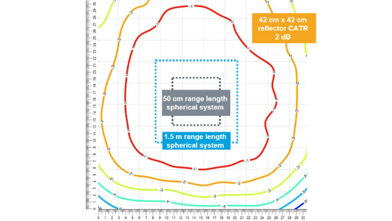 Da die Größe der QZ von den Reflektoreigenschaften abhängt und nicht vom Abstand zwischen Reflektor und Prüfling, ist es so wesentlich einfacher, innerhalb eines begrenzten Raums eine große QZ zu erzeugen. Bild 3 zeigt die nach Amplitude gemessene QZ-Größe von 27 cm bei 28 GHz eines CATR-Messsystems mit einem Reflektor von 42 cm x 42 cm ähnlich dem in Bild 2. Der in Bild 3 gezeigte CATR-Messaufbau lässt sich in einer Testkammer mit Abmessungen von nicht mehr als 2 m x 1,5 m x 0,85 m unterbringen. Ein direktes FF-Messsystem mit der gleichen QZ-Größe würde einen Messabstand von 14,5 m erfordern.