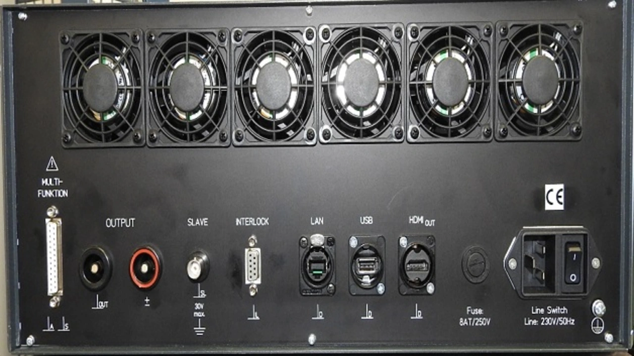 Für die bereits angesprochene Fühlerleitung, die die Spannung an einem beliebigen Punkt, beispielsweise an der ECU, entsprechend der Sollwertvorgabe (DC bis >200 kHz) regelt, sind Buchsen vorgesehen. Mit diesem speziellen Senseline-Anschluss gibt es keine unerwünschten Schwingungen. Zum Schutz der ECU kann man Grenzwerte für Spannung und Strom einstellen. Bei Überschreiten der Grenzwerte schaltet der Verstärker ab oder er begrenzt die Verstärkung, sodass die Kurvenform erhalten bleibt. Die Verlustleistungs- und die Temperaturanzeige der Endstufen geben über einen stabilen Betrieb Auskunft. Rechtzeitige Maßnahmen kann man gegebenenfalls einleiten. Die Belegung der Rückseite veranschaulicht Bild 5. Hier gibt es unter anderem Schnittstellen für einen Monitor (HDMI), Maus, Tastatur und USB-Speicher. Zudem gibt es eine LAN-Schnittstelle etwa für den Netzwerkanschluss oder für einen Funktionsgenerator. Eine WLAN-Funktion ist ebenso vorgesehen. Der 25-polige Sub-D-Stecker dient als Multifunktionsschnittstelle. (kv)
