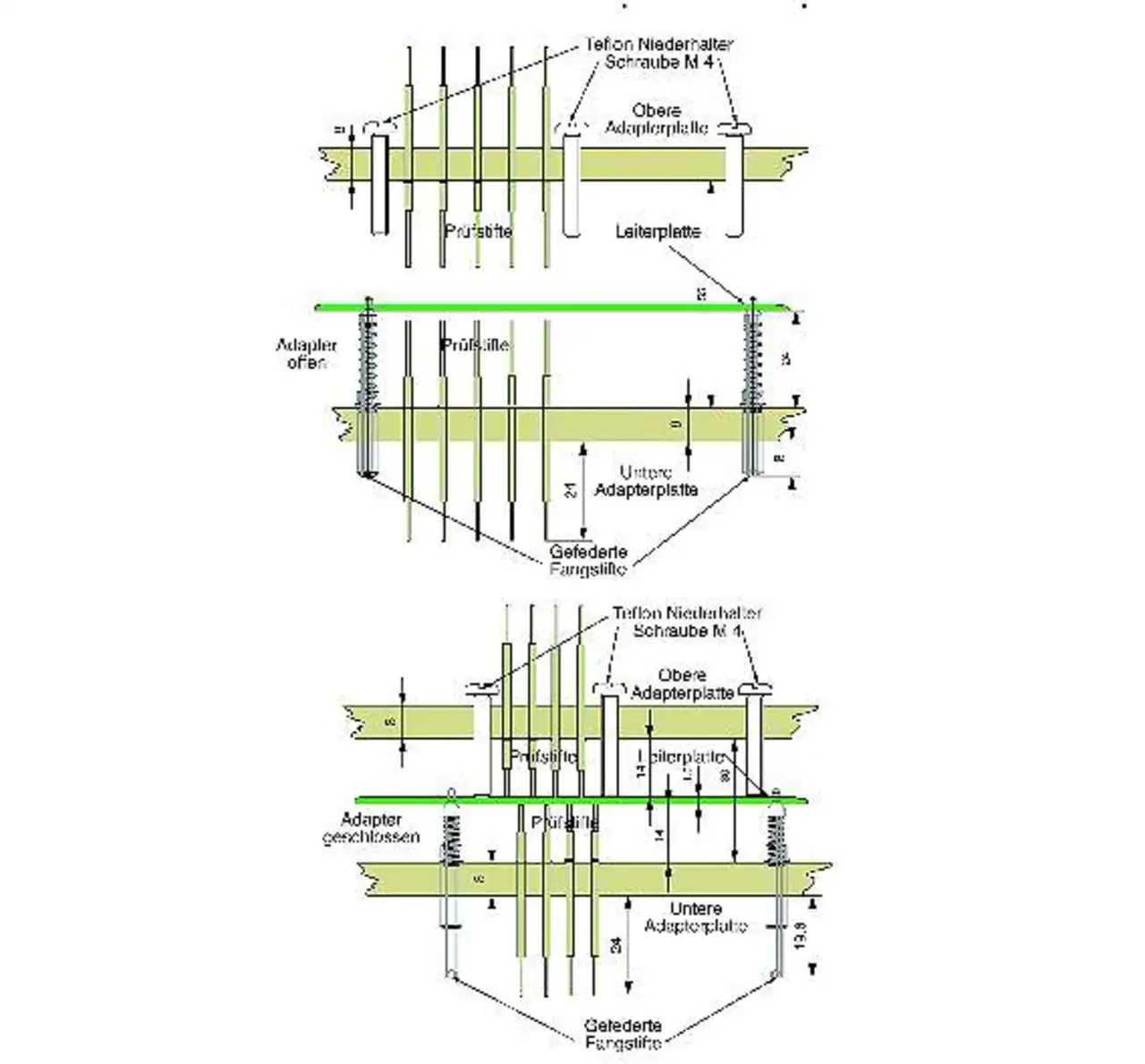 Wird also die Baugruppe auf die mehrheitlich eingesetzten kürzeren Stifte gedrückt, kann der In-Circuit-Test ausgeführt werden; für den Funktionstest lässt sich die Baugruppe um 5 mm nach oben fahren und mit den längeren Stiften, die ausschließlich dem Funktionstest dienen, der Funktionstest ausgeführt werden. Wenn unbedingt separate Prüfadapter für den In-Circuit- und den Funktionstest notwendig sind, gerade bei Baugruppen im Funkbereich, so ist ein Faradayscher Schutz um den Adapter anzubringen, um Störungen von anderen Quellen beziehungsweise vom eigentlichen Prüfling zu anderen Messeinrichtungen zu unterbinden (Bild 2).
