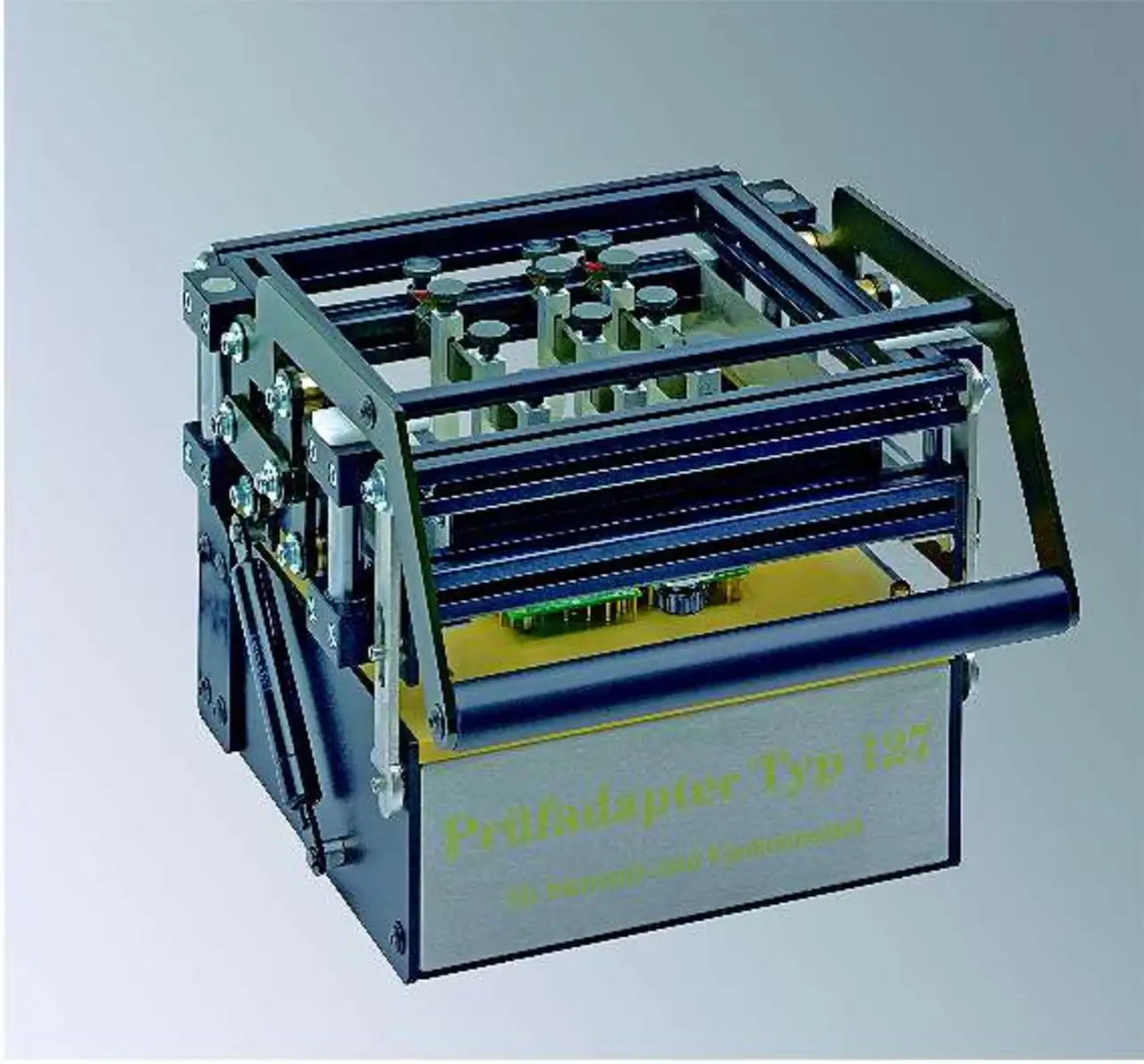 Noch heute ist es bei namhaften Firmen die Regel, dass bei einem Produktwechsel die Testadapter mit Flachbandkabeln und vielen, vielen Steckern von Hand ab- und wieder angesteckt werden müssen. Bei den hier behandelten Adaptern besteht eine Verbindung zwischen den 18 VG-Leisten und der Adapterschublade. Der mechanische Grundadapter lässt eine Prüflingsgröße von 230 mm x 360 mm zu.