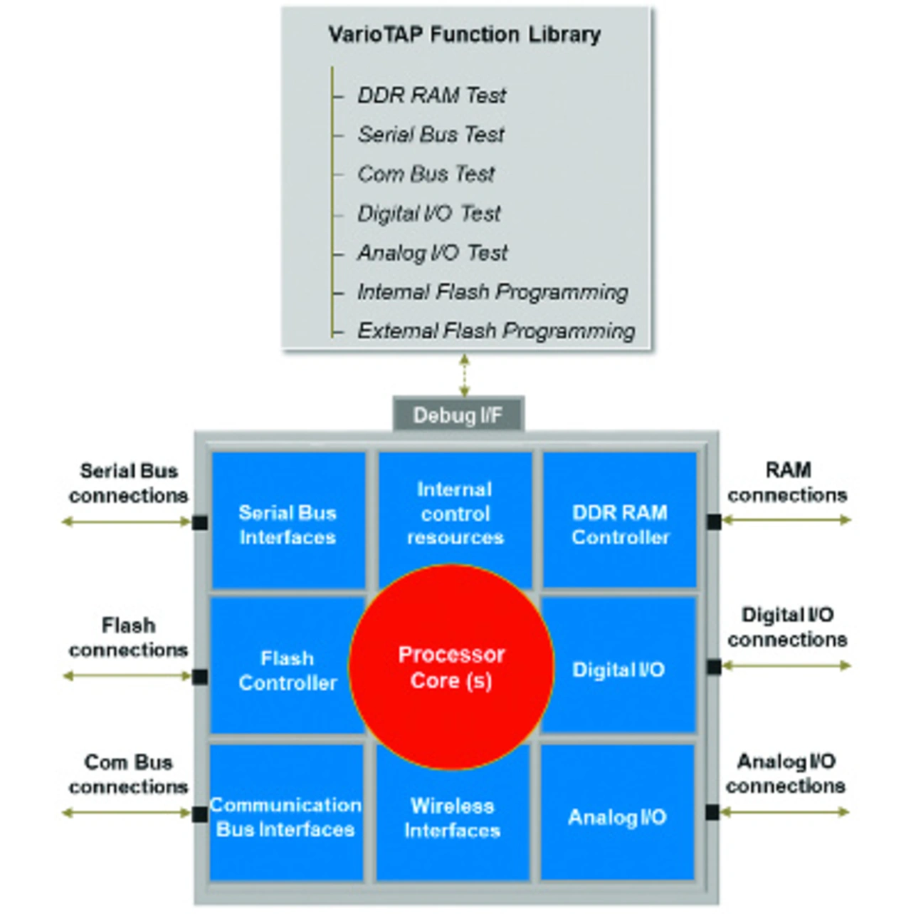 Mikrocontroller und Mikroprozessoren können über eine Technik namens „VarioTAP“ auf Basis von Embedded-IP-Instrumenten für den Baugruppentest eingebunden werden. Die Testabdeckung umfasst statische und dynamische Fehler, z.B. beim Test von DDR-DRAM-Bausteinen (Bild 1). Damit eröffnen diese Testwerkzeuge mit ihren Funktionsbibliotheken die Möglichkeit, ein Produkt über den gesamten Lebenszyklus von der Entwicklung und Fertigung bis hin zur Reparatur von Baugruppen zu begleiten.