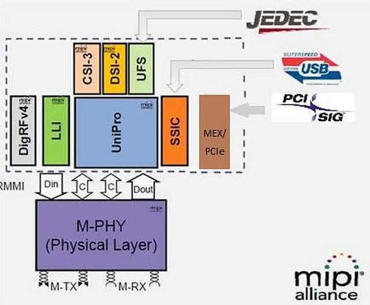 Die M-PHY Spezifikation ist eine Neuentwicklung für einen langfristigen Einsatz. Es wurde ein serieller PHY mit geringer Pin-Zahl und integriertem Takt entwickelt, der mehrere Transfer- und Energiesparmodi unterstützt. M-PHY unterstützt Datenraten von 10 kbps bis zu 5,8 Gbps. Dies ist eine ausreichende Bandbreite, um die verschiedenen Datenschnittstellen innerhalb eines mobilen Geräts zu unterstützen. Schnittstellen, die M-PHY verwenden, beinhalten mehrere MIPI Standards (CSI-3, DSI-2, LLI, UniPro und DigRF), den USB SSIC Standard, den Universal Flash Storage (UFS) Standard und seit kurzem auch den M-PCIe Standard. Die Schnittstellen sind in einer Schichtstruktur organisiert (Bild 1).