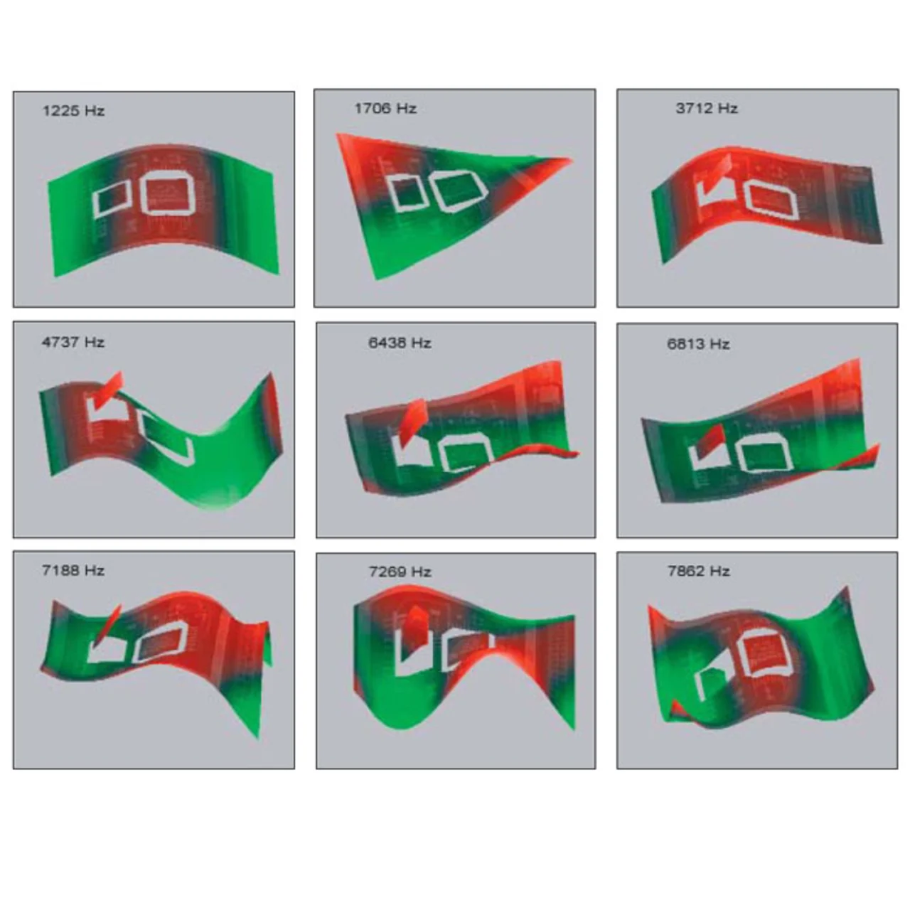 Zur Messung der Schwingamplituden bevorzugt man berührungslose Verfahren, weil sie – im Gegensatz zu aufmontierten Beschleunigungssensoren – keine Rückwirkung auf das Objekt ausüben. Verbreitet ist Laser-Interferometrie. Hier wird der Strahl eines HeNe-Lasers in zwei Teilstrahlen zerlegt. Der „Objektstrahl“ trifft auf einen Punkt der schwingenden Oberfläche; das von hier aus rückgestreute Licht passiert erneut den Stahlteiler und interferiert mit dem zweiten Strahl, dem „Referenzstrahl“. Bewegt sich die zu messende Struktur, wird die Lichtintensität proportional zur Schwinggeschwindigkeit moduliert. Immer dann, wenn sich das Messobjekt um eine halbe Wellenlänge verschiebt (hier 316 nm), durchläuft die Intensität einen Hell/Dunkel-Zyklus. Ein lichtempfindlicher Detektor wandelt diese Änderung in ein elektronisches Signal um. Die Frequenz der Zyklen ist proportional zur Geschwindigkeit des Messobjekts. Damit sind auch Messungen an schwer zugänglichen und thermisch beanspruchten Orten möglich. Wie sich eine Leiterplatte bei verschiedenen Frequenzen verbiegen kann, verdeutlicht Bild 1. Auf dem PC-Bildschirm lässt sich das auch als Animation darstellen – stark verlangsamt und so für das Auge gut erkennbar.