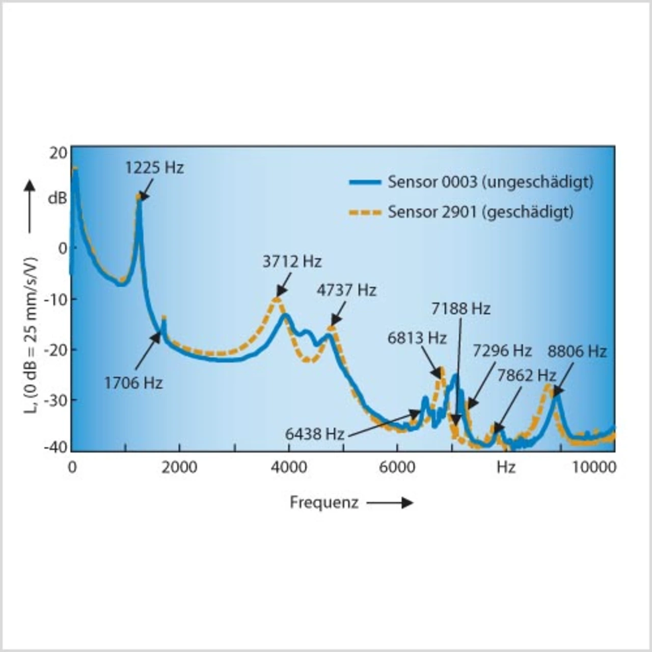Über alle diese Messverfahren verfügt die Firma Amitronics in Seefeld bei München (www.amitronics.de). Die Auswahl geschieht nach Erfordernis. Alle Geräte sind mobil. Im Rahmen des Forschungsprojekts „Longlife“ hat man hier die Langzeitstabilität von Neigungssensoren untersucht. Dazu wurden sie 500 Temperaturzyklen zwischen –40 und +150 °C ausgesetzt; vorher und hinterher wurde ihr Schwingungsverhalten vermessen. Es waren deutliche Unterschiede zu erkennen, die darauf hinweisen, dass die Sensoren durch diese harte Beanspruchung durchaus verändert worden sind, auch wenn sie scheinbar noch einwandfrei funktionieren. In Bild 2 sind beide Messkurven übereinander gelegt. Bei dem gestressten Exemplar (rote Kurve) liegen die Eigenfrequenzen tiefer als bei dem intakten (blaue Kurve), d.h., die Gesamtstruktur ist weicher geworden. le