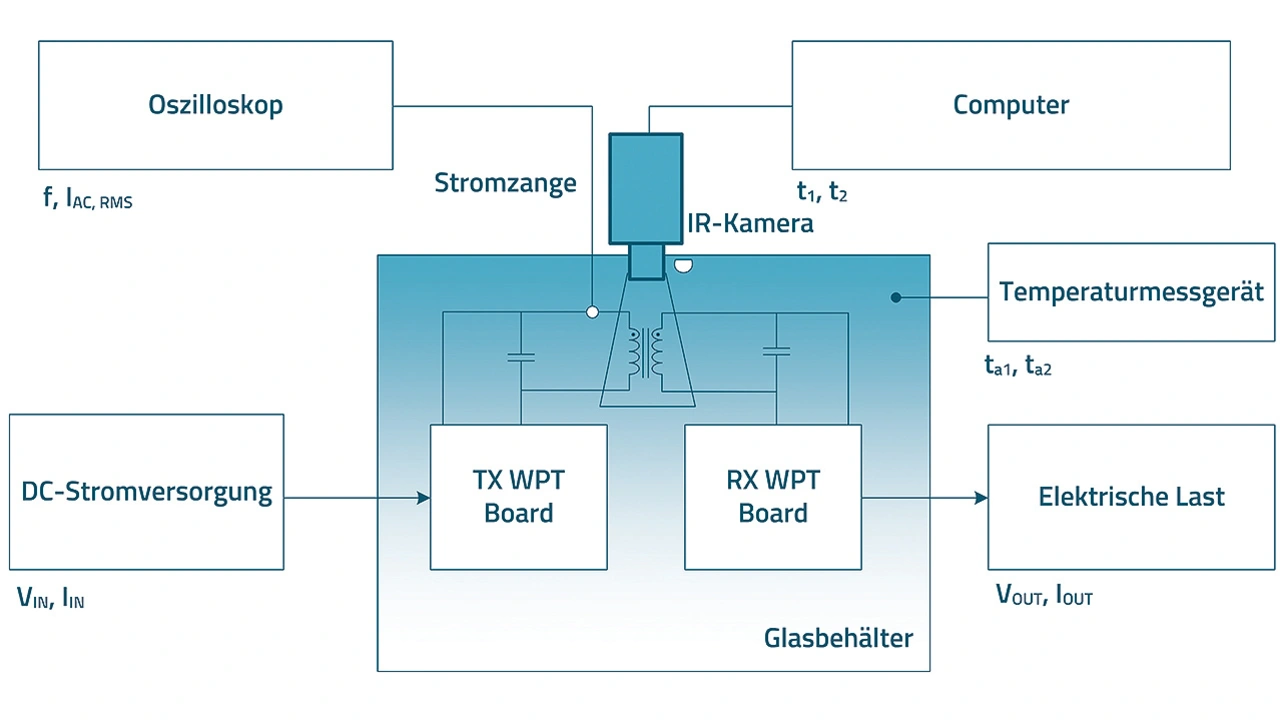 Die Schaltfrequenz kommt zur Abstimmung der Schaltung zum Einsatz und ermöglicht es, eine optimale Betriebsfrequenz zu finden, bei der die Spulen einen maximalen Wirkungsgrad aufweisen. Die Empfängerplatine (Rx) verfügt über eine Gleichrichterschaltung in ähnlicher Topologie wie die des Senders, um den Wechselstrom in Gleichstrom zurückzuwandeln. Auf der Seite der Empfängerplatine wird eine elektrische Last angeschlossen. Eine Stromsonde, die sich an den Zuleitungen der Tx-Spule befindet, misst den durch die Spule fließenden Wechselstrom, der auf dem Oszilloskop angezeigt wird. Die Tx- und Rx-Spulen sind durch Plexiglas-Abstandshalter voneinander getrennt. Der gesamte Aufbau der Tx- und Rx-Platinen mit den Tx- und Rx-Spulen und der Stromsonde befindet sich, wie oben erwähnt, in einem Glaskasten. Dieser Glaskasten erhöht die Sicherheit und reduziert den Luftstrom. Ein Ausschnitt an der Oberseite des Kastens ermöglicht das Einsetzen einer Infrarot-Wärmebildkamera zur Messung der Oberflächentemperatur des Ferrits auf der Tx-Spule. Der Betrieb der Infrarotkamera wird durch eine auf dem PC vorinstallierte Kamerasoftware gesteuert. Ein tragbares Temperaturmessgerät außerhalb des Kastens erfasst die Raumtemperatur.