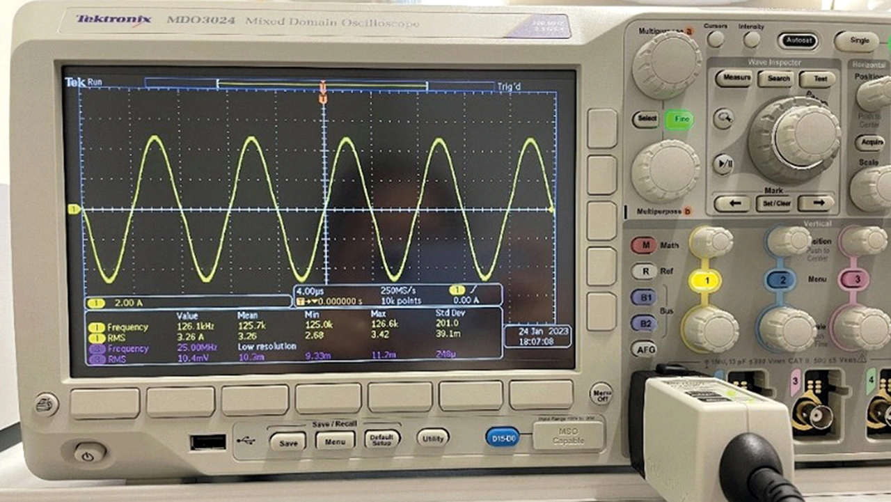 Der auf dem Oszilloskop beobachtete RMS-Stromwert für die Spule ist in Bild 3 dargestellt. Der Abstand zwischen den Spulen kann optimiert werden, bis der gewünschte Betriebspunkt erreicht ist.