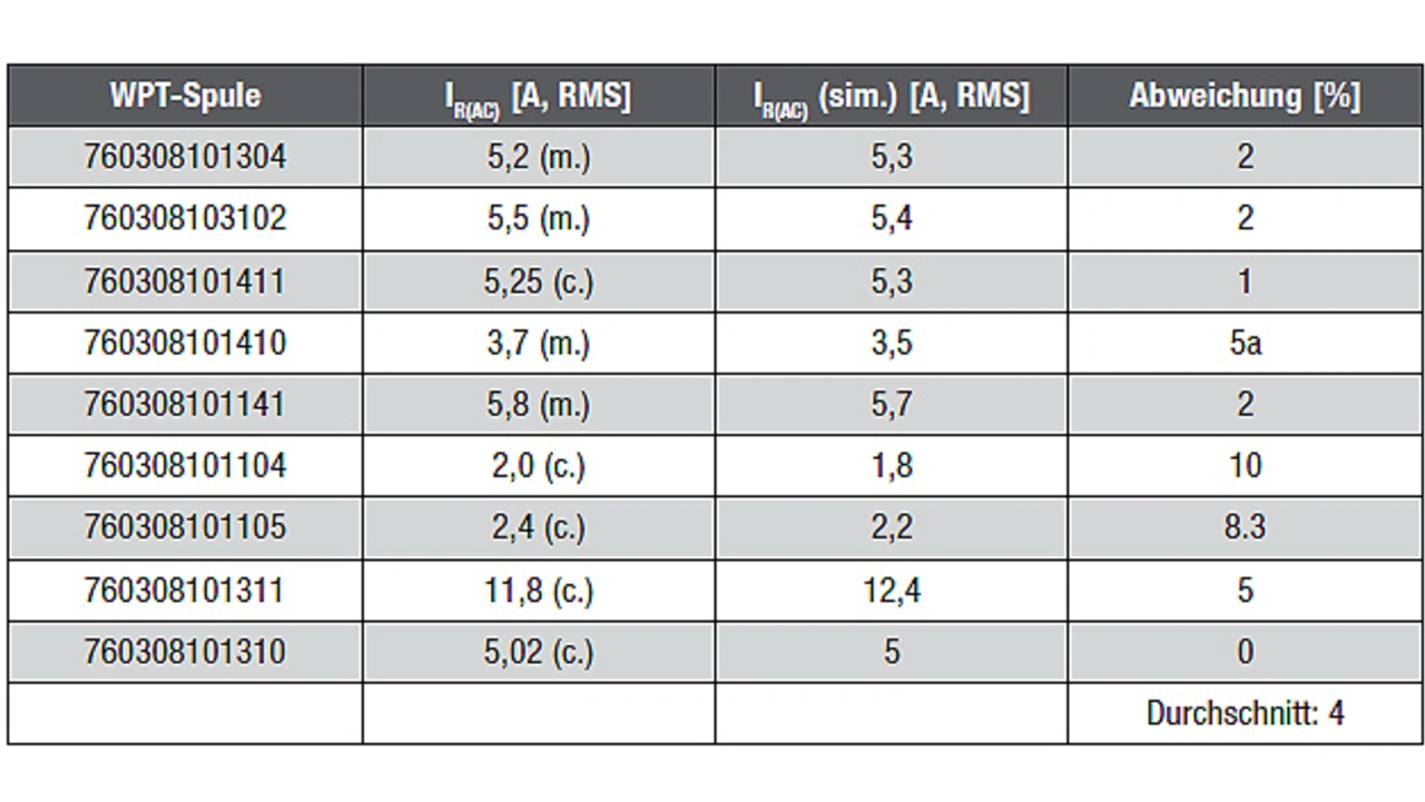Die Tabelle zeigt, dass die Abweichung der simulierten IR(AC)-Werte der geprüften Spulen im Durchschnitt nur 4 % im Vergleich zu den gemessenen oder berechneten Werten von IR(AC) beträgt.