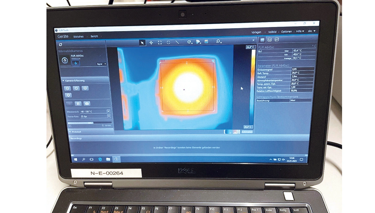 Die von der Spule erzeugte Wärme wird mit der Infrarot-Wärmebildkamera gemessen. Die Kamera erfasst die Temperatur der heißesten Stelle auf der Ferritoberfläche und zeigt die Werte im Flir-Kameraprogramm auf dem PC an (Bild 4).