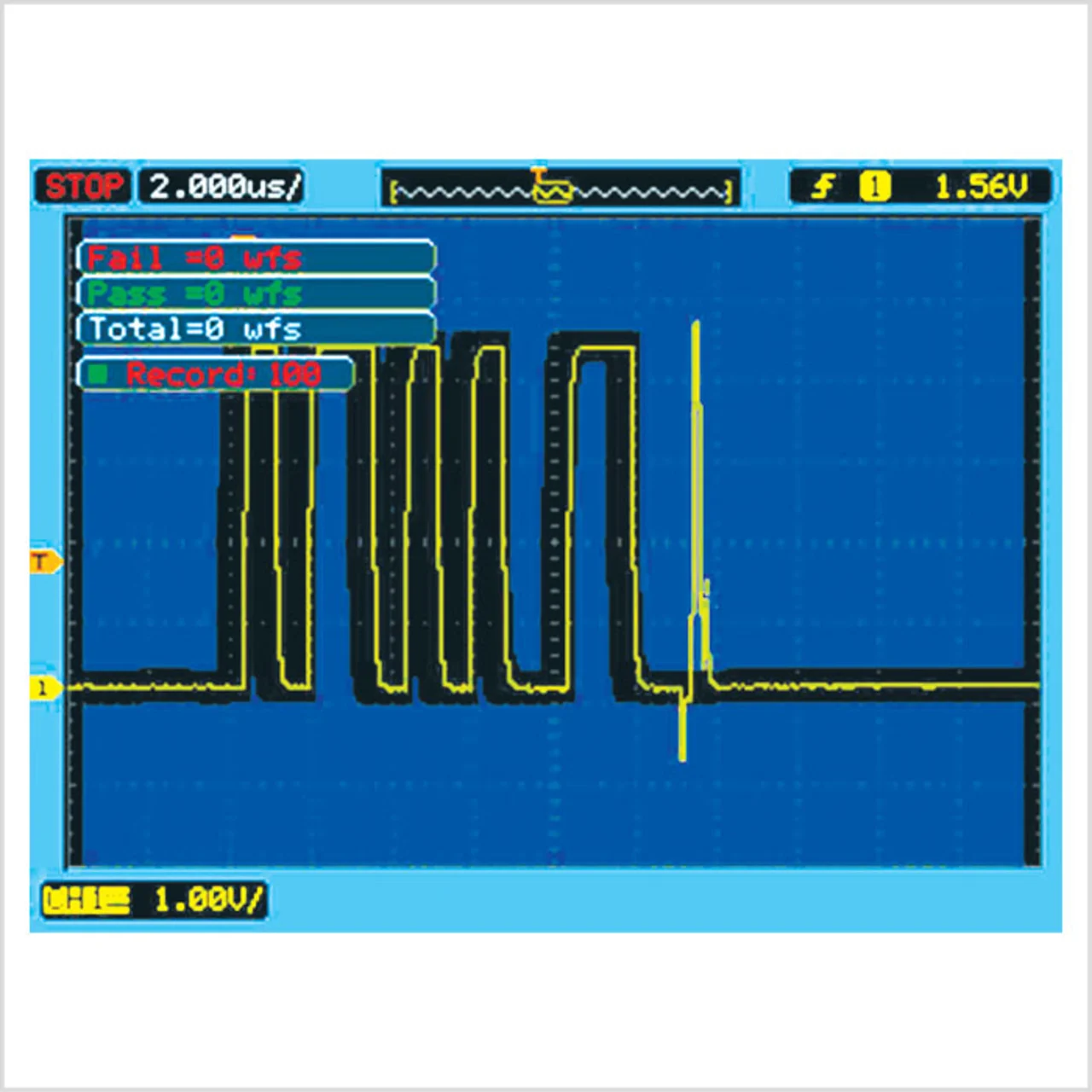 Das ist besonders dann hilfreich, wenn man Glitches erfassen will, die nur selten auftreten, oder wenn man Messungen über lange Zeit laufen lassen muss und sie später analysieren will. Bild 5 zeigt als Beispiel, wie man auf einem Oszilloskop des genannten Typs den Sequenzmodus mit dem Maskentest kombinieren kann.