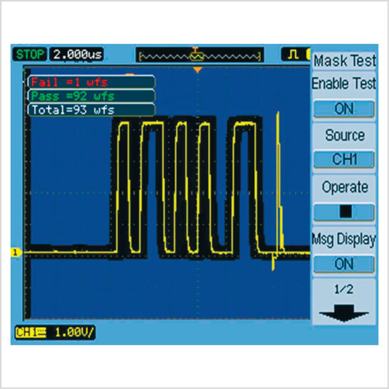 Ein Qualitätstest soll ja sicherstellen, dass die Produkte gleichbleibend ihre Leistungsdaten erreichen und die Ausschussquote möglichst gering bleibt. Will man das aber gewährleisten, muss man Dauermessungen durchführen, das gleiche Signal also mit einer großen Zahl von Einzelmessungen über längere Zeit beobachten. Der Maskentest trifft in solchen Fällen eine schnelle Aussage darüber, ob ein Signal seinen Soll-Verlauf ausreichend einhält oder nicht. Für den Maskentest wird, basierend auf einer aktuell dargestellten Messkurve, eine Maske definiert und festgelegt, dass jede folgende Messkurve innerhalb dieser Maske liegen muss. Man erfasst also zuerst ein „goldenes“ Soll-Signal, legt Toleranzgrenzen fest und erzeugt damit eine Umhüllende. Nachfolgende Eingangssignale werden dann mit dem Toleranzbereich verglichen und unmittelbar als „korrekt“ oder „fehlerhaft“ erkannt.
