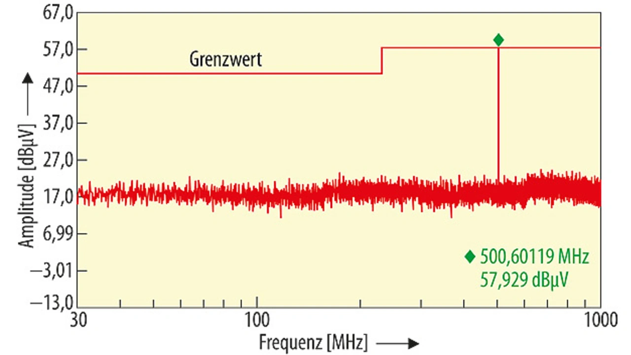 Eine gewöhnliche Prescan-Messung, die die Modulation außer Acht lässt, zeigt ein 500,6-MHz-Signal mit einen Pegel von etwa 58 dBµV an (Bild 2). Ohne eine genauere Analyse würde eine abschließende Messung bei dieser Frequenz das Emissionsmaximum nicht korrekt erfassen und andere Frequenz-/Amplituden-Messwertpaare ergeben. Im ungünstigsten Fall – wenn nämlich der beim Prescan gemessene Signalpegel aufgrund der Amplitudenmodulation unter dem Grenzwert liegt – würde das Signal nicht einmal als verdächtig eingestuft.