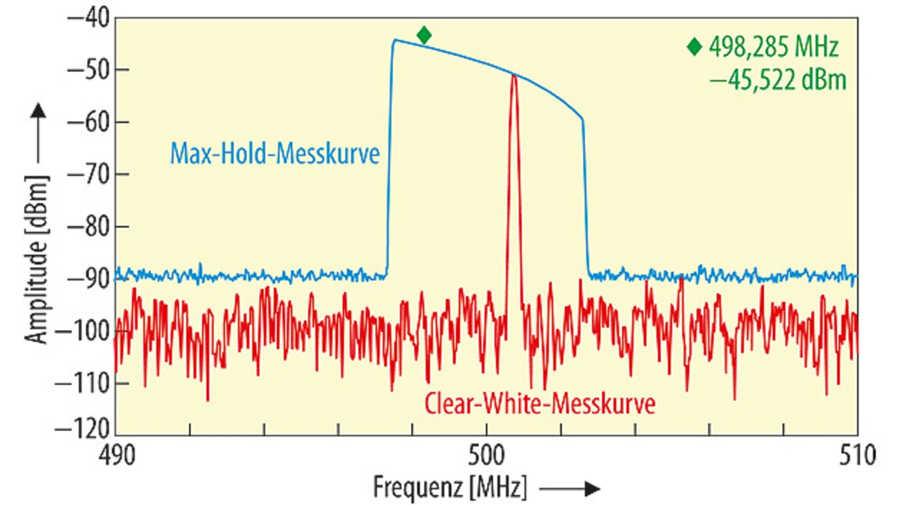 Eine genauere Untersuchung mittels Spektrumanalyse oder ZF-Spektrumüberwachung, wie sie mit modernen EMV-Messempfängern möglich ist, macht die Modulation sichtbar und liefert die korrekte Amplitude und Frequenz des Störsignals. Bild 3 zeigt das Ergebnis einer Messung mit Spektrumanalyse. Die blaue Max-Hold-Messkurve zeigt die Modulationshüllkurve des Signals; die rote Clear-Write-Messkurve zeigt die momentane Amplitude und Frequenz des Signals. Mit Hilfe von Markerfunktionen, wie sie bei modernen EMV-Messempfängern üblich sind, kann man anhand der Max-Hold-Messkurve die korrekte, spitzenwertdetektierte Amplitude und die zugehörige Frequenz bestimmen, bei der dann die abschließende Messung mit gewichtendem Detektor durchgeführt wird. Ingenieure und Techniker können die Leistungsfähigkeit des Spektrumanalysators voll ausschöpfen und das Störsignal noch unter weiteren Aspekten diagnostizieren, um die Ursache der Emission herauszufinden und das Produkt so zu modifizieren, dass es den Konformitätstest besteht.