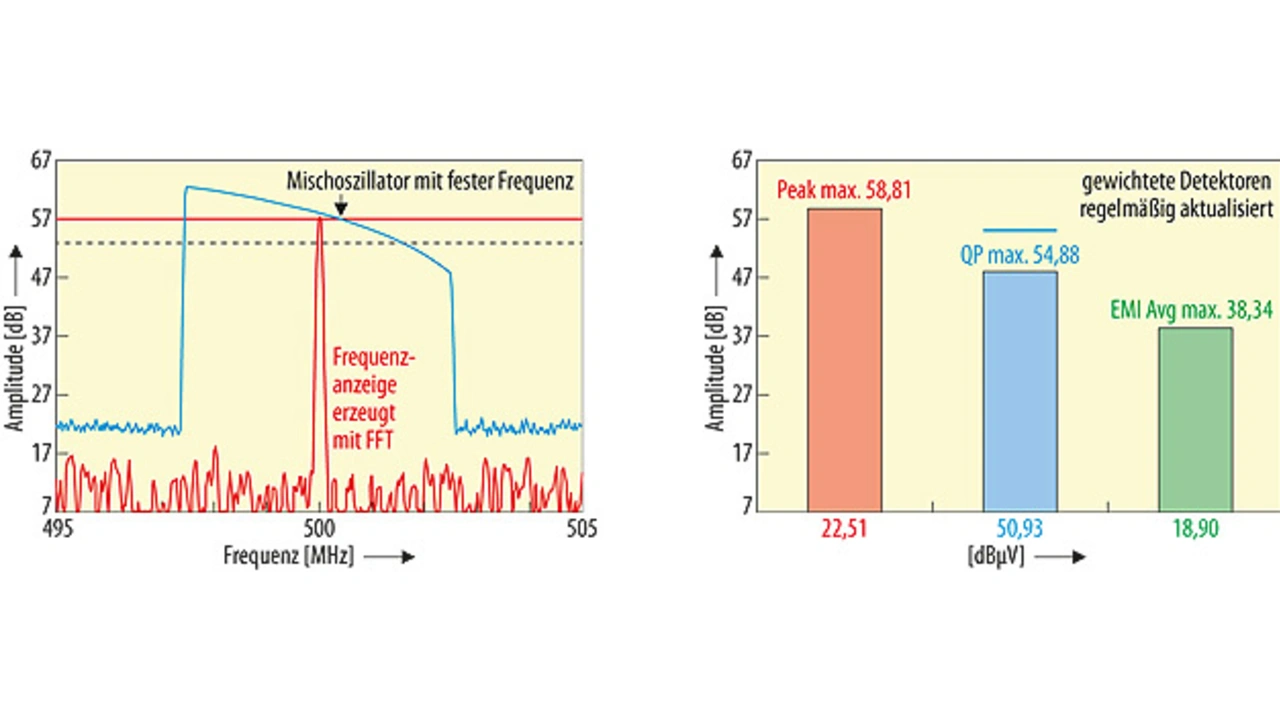 Das folgende Beispiel demonstriert den Nutzen der beiden Prescan-Analysetools. Betrachten wir die Messung eines 500-MHz-Störsignals mit einem Pegel von 64 dBµV, einem FM-Frequenzhub von 5 MHz und einer Amplitudenmodulation von ~25 dB. Dieses Signal wird dem Messempfänger zugeführt und mit folgenden Einstellungen gemessen: 120 kHz CISPR-Bandbreite, 2 Messpunkte pro RBW und 62 s Verweildauer (das entspricht einer Scan-Zeit von 1 s – dieser Wert liegt knapp über der für diesen Frequenzbereich vorgeschriebenen Mindest-CISPR-Scan-Zeit von 970 ms).