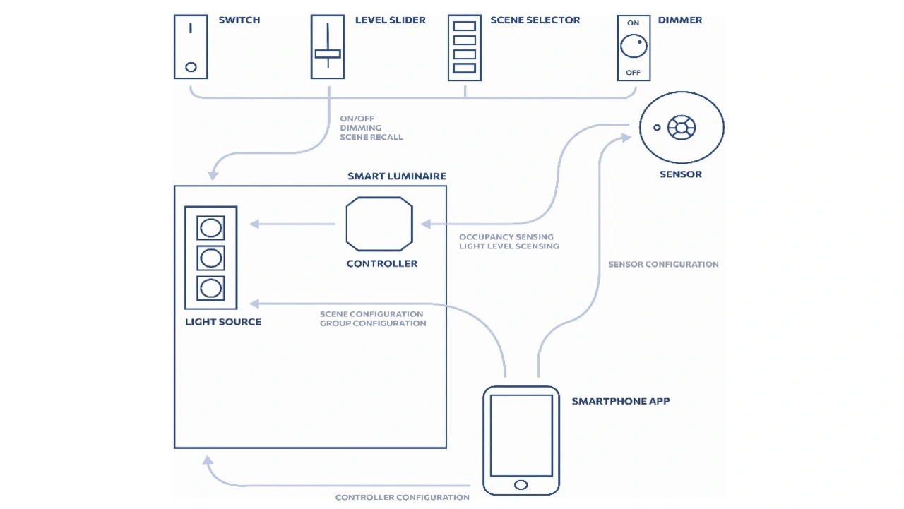 ...bietet mehrere weitere Vorteile, darunter eine schnelle Bereitstellung und eine einfache Neukonfiguration. Durch die Funkkommunikation lässt sich die Beleuchtungsinfrastruktur auch für andere Zwecke nutzen, z. B. zur Ortung von Mitarbeitern oder Bewohnern in Innenräumen, zur Verfolgung von Gütern, zur Datenerfassung für die vorbeugende Wartung, zur besseren Raumnutzung und zur Umsetzung effektiverer Beleuchtungspläne. Darüber hinaus können Funksensoren in Beleuchtungskörpern auch als Eingang für andere smarte Gebäudesteuerungen wie Heizung und Klimaanlagen dienen. Die Hauptkomponenten eines smarten Beleuchtungssystems sind in Bild 1 dargestellt.