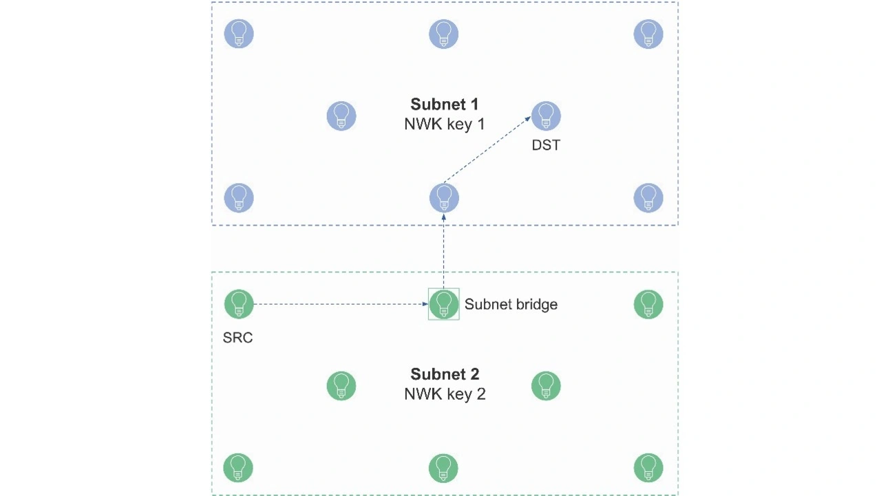 Bei Bluetooth Mesh 1.0 waren Subnetze vollständig voneinander isoliert. Bluetooth Mesh 1.1 behebt dieses Manko mit Subnetz-Bridging und ermöglicht jetzt die Kommunikation zwischen Geräten in verschiedenen Subnetzen. Die Technik leitet den Datenverkehr zwischen verschiedenen Subnetzen weiter. Der Netzwerkplaner muss vorab Brückenknoten auswählen. Diese speichern Bridging-Tabellen mit Netzwerkschlüsseln (NWK), Geräteadressen in beiden Subnetzen und Informationen darüber, in welche Richtung der Datenverkehr fließen kann (Bild 2). Subnetz-Bridging ermöglicht eine nahtlose Kommunikation über verschiedene Subnetze hinweg, ohne die Sicherheitsfunktionen zu beeinträchtigen, die normalerweise durch die Verwendung von Subnetzen und Isolation bereitgestellt werden.