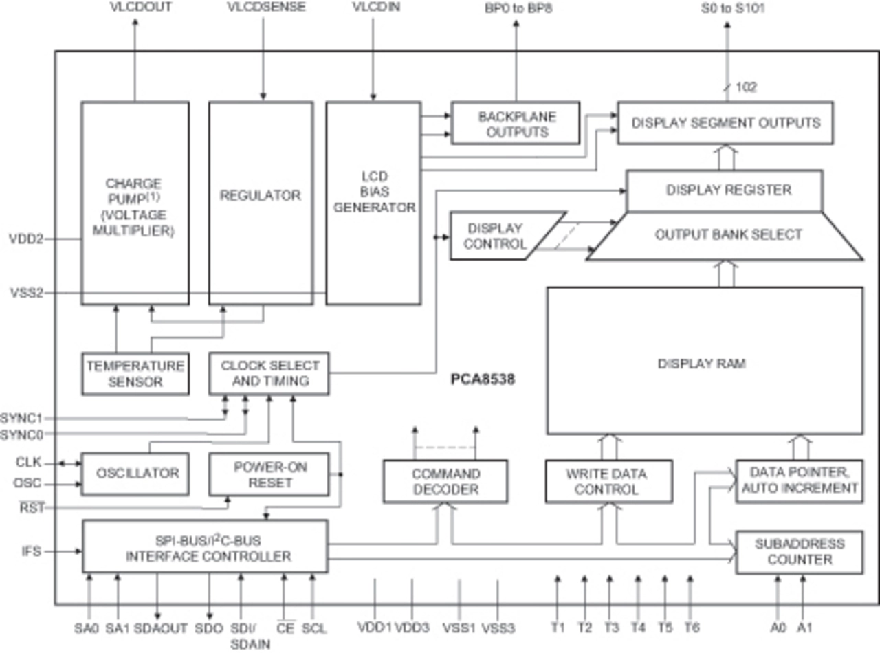 Die LCDs können aus bis zu 9 Backplanes mit jeweils 102 Segmenten bestehen, so dass insgesamt 918 einzelne Displayelemente angesteuert werden können. Zum Beispiel ist mit dem PCA8538 eine Darstellung von 114 7-Segment-Anzeigen pro Display möglich. Für größere Displays lassen sich bis zu vier dieser Treiber-ICs in Reihe schalten. Die Kommunikation zum Mikrocontroller erfolgt wahlweise per I²C oder SPI.