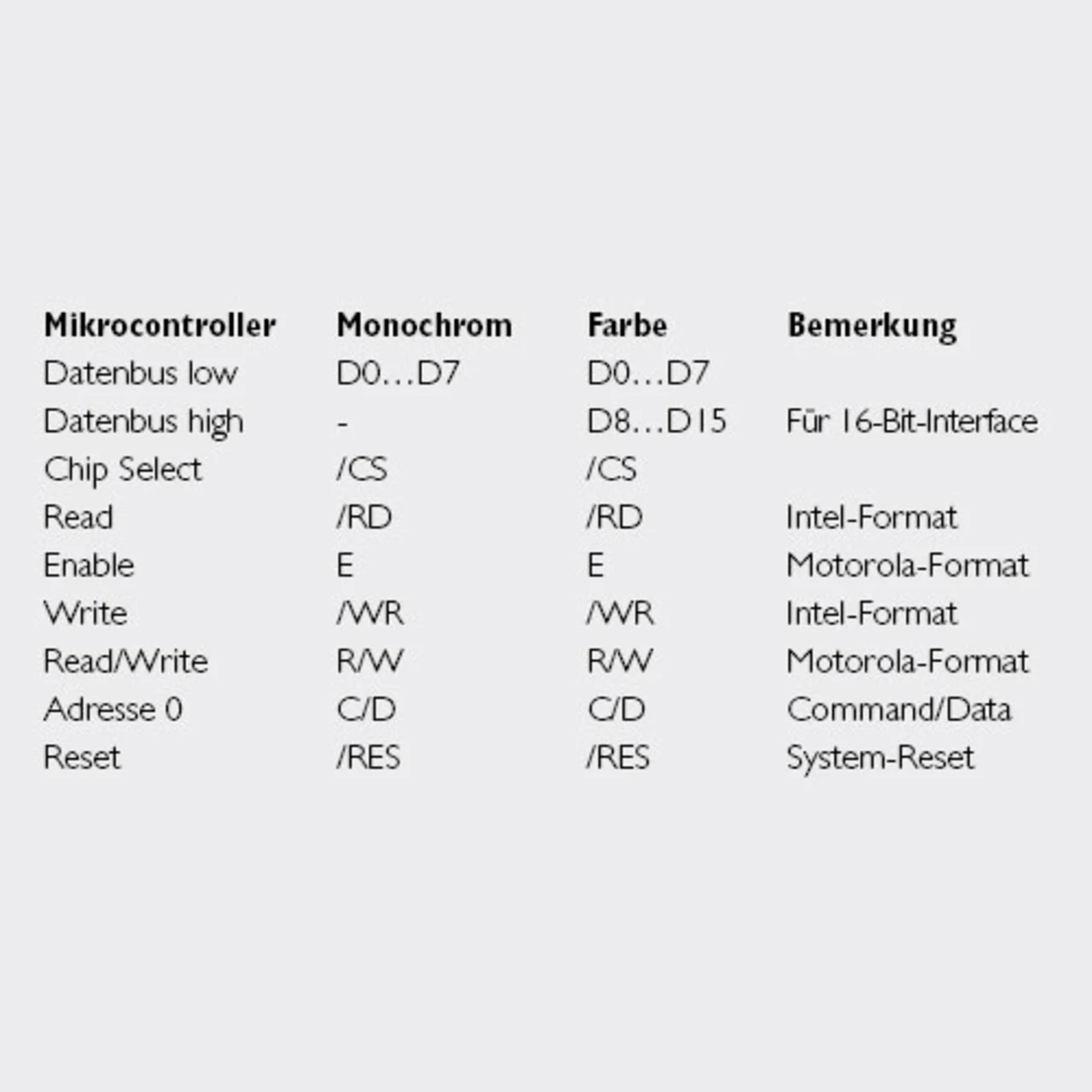 Tabelle 1 zeigt den Zusammenhang zwischen den Schnittstellen einer monochromen Anzeige und des TFT-Farbdisplays. Falls der Mikrocontroller über einen 16 Bit breiten Bus verfügt, können auch die oberen acht Bits zum Datentransfer dienen, was die Zugriffsgeschwindigkeit auf das Display steigert. Monochrome Module entlasten das System durch einen eingebauten Zeichengenerator. Anstelle pixelgenauer Bitmaps erhält der Controller nur ASCII-Codes, liest dann aus einem Zeichengenerator-ROM die den Buchstaben entsprechenden Bitmuster aus und stellt sie dar. Leider ist die Darstellung nicht mehr zeitgemäß: Kleinbuchstaben wie g, j, p, q und y sind ohne Unterlängen dargestellt, Umlaute fehlen, und manche Zeichen wie beispielsweise l und 1 sehen einander zu ähnlich. Das Nachladen dieser Zeichen in einen RAM-basierten Zeichengenerator ist möglich, erfordert aber weiteren Aufwand.
