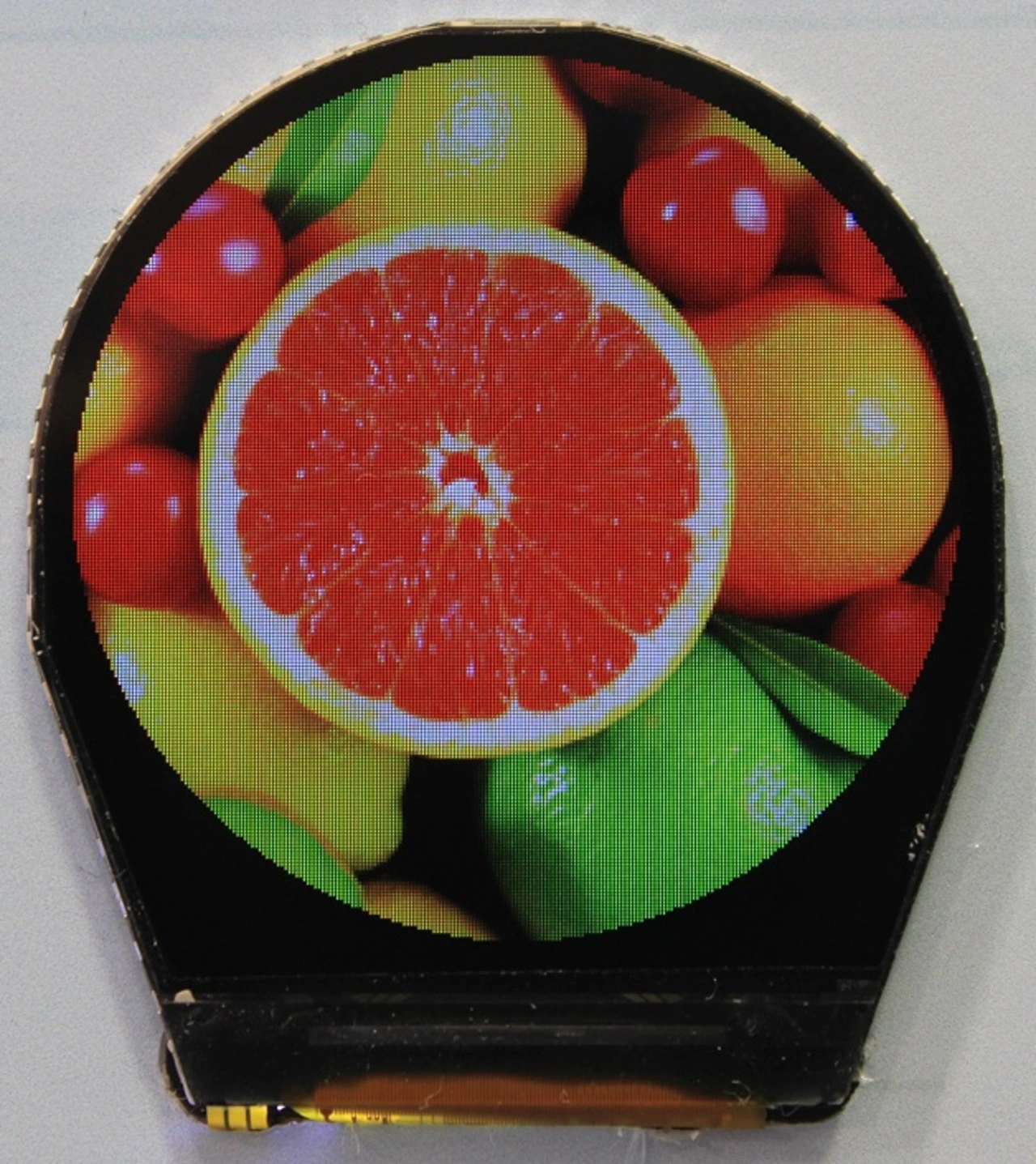 Smart-Watches oder Fitness-Uhren verwenden runde Displays. Hier werden die Ansteuerleitungen für Zeilen und Spalten am Rand des Sichtbereichs geführt. Beim in Bild 4 gezeigten Display liegt der Treiber als Single-Chip-Lösung am unteren Ende des Glases, sodass das Gehäuse entsprechend geformt sein muss.