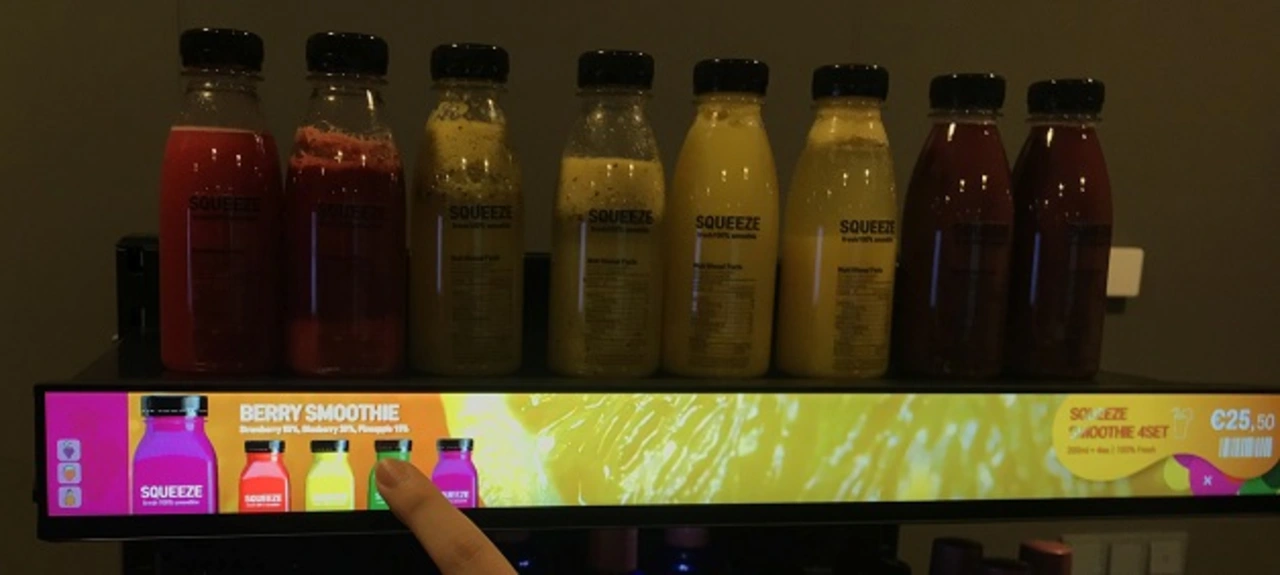 Im Porträtformat finden schlanke Displays dort Verwendung, wo lange Listen ausgegeben oder der Platz an einem Getränkeautomaten (Bild 6) oder einer Aufzugsteuerung genutzt werden soll. Mit einem Touchscreen versehen, bieten sie dem Kunden einen Mehrwert, indem sie etwa beim Getränkeautomaten weitere Informationen zum gewählten Produkt geben oder Alternativen anzeigen.