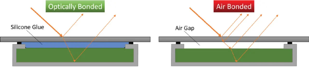 Um Reflexionen zu vermeiden, verwendet der Hersteller beim OCA-Bonding Klebefolien. Sie verbinden mithilfe von Rolllamination oder Fügen im Vakuum-Touch-Sensor Gläser direkt miteinander. Im Nachgang entfernt ein Autoklav mögliche Luftblasen und härtet den Verbund aus. Innerhalb der realisierbaren Diagonalen bis etwa 30 Zoll sind Touchscreens mittels OCA-Bonding schnell und kostenoptimiert produzierbar. Allerdings hat das Verfahren den Nachteil, dass die Klebeschicht auf dem Touch-Sensor lediglich begrenzt Höhenunterschiede ausgleichen kann, was das Coverglas relativ stoßempfindlich macht. Ebenso lassen sich mit dem Verfahren keine Displaymodule bonden.