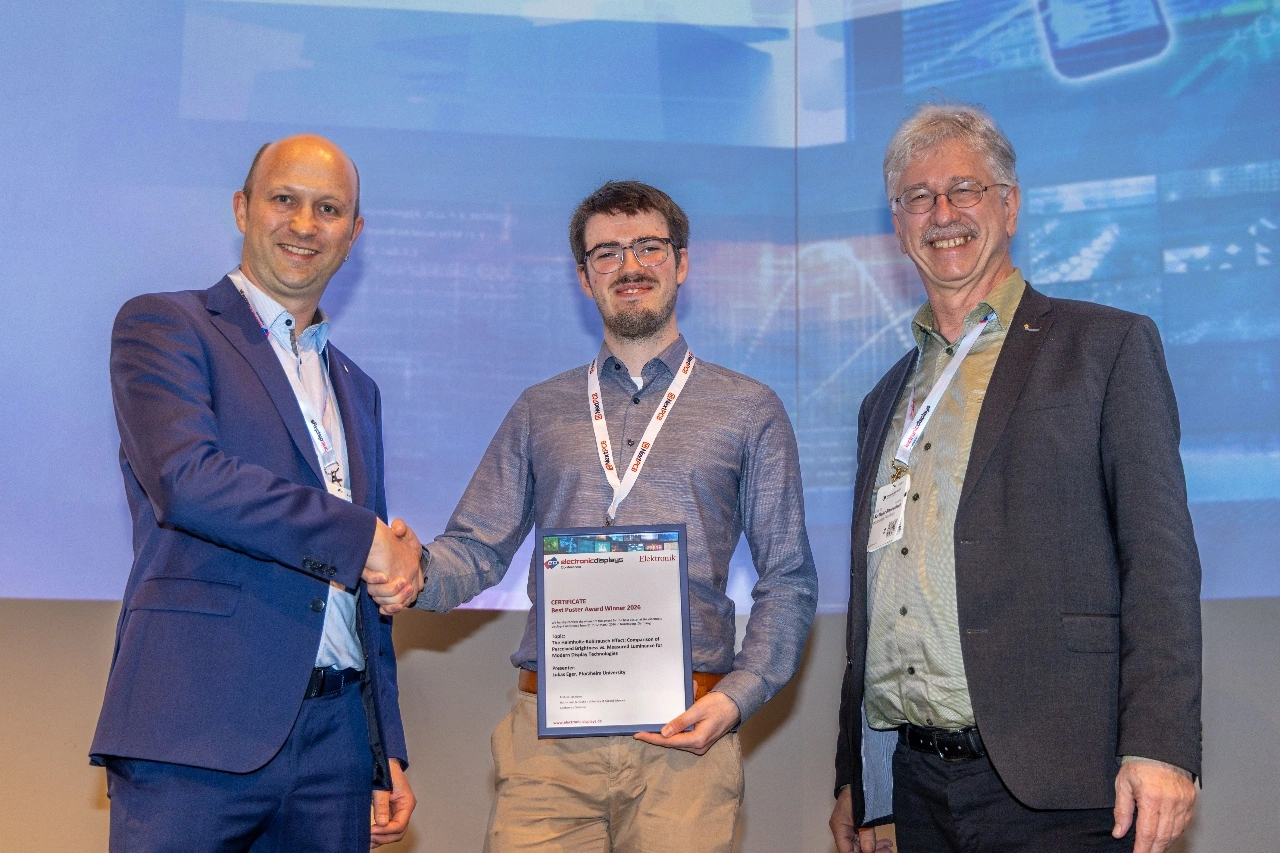 Am zweiten Konferenztag verlieh Chairman Prof. Dr. Jan Bauer den „Best Poster Award“, dessen Gewinner aus allen in der Poster Area im Konferenzfoyer ausgestellten Postern ausgewählt wird. Der diesjährige Preisträger ist Lukas Eger von der Hochschule Pforzheim. Er erhielt den Best Poster Award für sein Poster zum Thema „The Helmholtz-Kohlrausch Effect: A Comparison of Perceived Brightness vs. Measured Luminance for Modern Display Technologies.