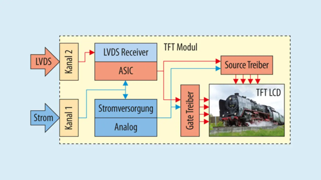 Auf der Controllerleiterplatte befindet sich der Displaycontroller mit entsprechender Peripherie. Der Displaycontroller stellt zeilenweise die RGB-Daten zur Verfügung und schickt sie zum Display. Heute hat ein Modul in der Regel eine LVDS-Schnittstelle nach außen, um größere Datenmengen störungsfrei zu übertragen. Das setzt einen Controller voraus, der die differenziellen LVDS-Signale in RGB umsetzen kann und den LVDS-Receiver bereits an Bord hat (Bild 3). Zusätzlich werden die Synchronsignale horizontal und vertikal generiert.