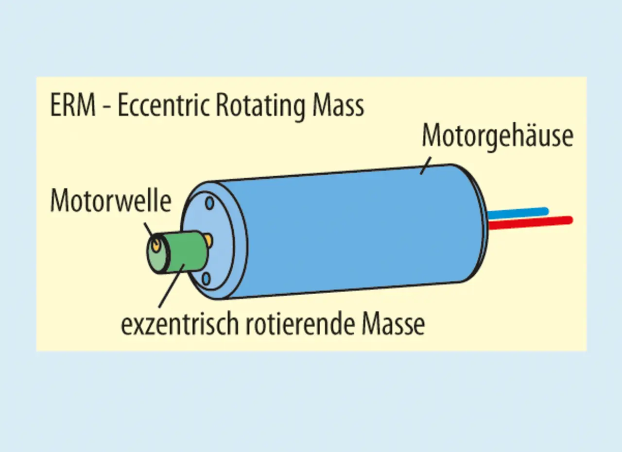 Die ersten Ansätze wurden mit rotierenden Exzentergewichten (Eccentric Rotatin Mass, ERM) oder linearen Masse-Aktoren (Linear Resonant Actuator, LRA) ausgeführt. Siehe dazu auch Bild 1 und Bild 2. Hierbei wird ein Gewicht durch einen Motor oder eine Magnetspule in Bewegung versetzt. Aufgrund der Masseträgheit entsteht ein Impuls, der auf die Oberfläche übertragen wird. So entsteht eine Art haptische Reaktion, die jedoch meist nur als Vibration empfunden wird. In abgewandelter Form und auf kurze Impulse reduziert, kommt diese Methode heute z.B. in Smartphones zum Einsatz.