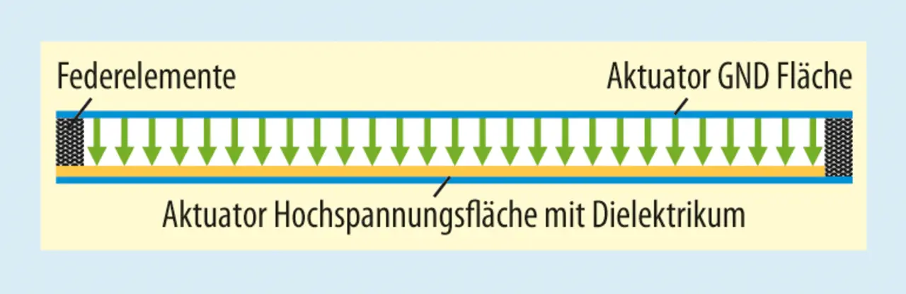 Ebenfalls schon länger bekannt und durch diverse Patente abgesichert ist das elektrostatische Prinzip. Dabei werden zwei leitende Platten durch entsprechende Polarisation gegenseitig angezogen oder abgestoßen (Bild 3). Durch entsprechend hohe Spannung kann auf diese Art ein kurzfristiger Impuls erzeugt werden, der dann auf der Oberfläche die Fingerkuppe stimuliert. Um mit dem elektrischen Feld genügend Kraft zu erzeugen, ist eine gewisse Fläche notwendig, im Idealfall die ganze Displayfläche. Zudem müssen beide Elektroden mechanisch auf Abstand gehalten werden.