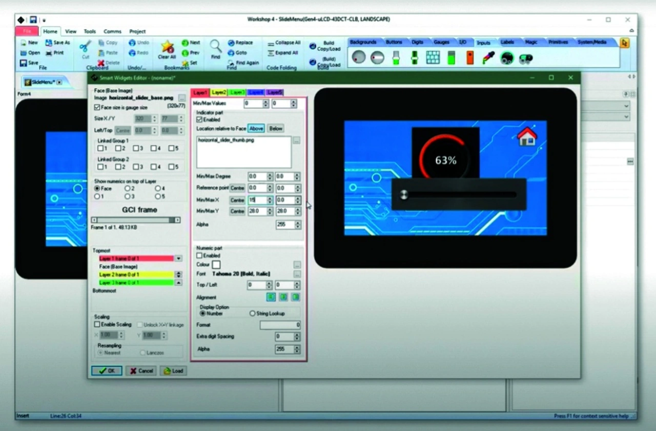 Um Entwicklern von Embedded-Systemen die Entwicklung professioneller Displays zu erleichtern, bietet 4D Systems die visuelle integrierte Entwicklungsumgebung (Integrated Development-Environment, IDE) Workshop 4 an (Bild 4). Die IDE Workshop 4 bietet Tools und gebrauchsfertige Widgets wie Messanzeigen, Schieberegler, Räder und Schriftarten, damit sich Entwickler auf die Anwendungssoftware konzentrieren können, ohne sich um die visuellen Aspekte der MMS Gedanken machen zu müssen.
