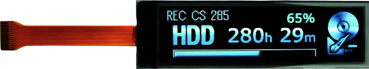 Ein Beispiel für OLED-Displays ist die EL-Serie von Futaba. Diese dünnen, leichten Displays mit geringer Stromaufnahme sind in diversen Größen von 0,5 bis 3,6 Zoll verfügbar. Sie bieten außerdem hohe Kontraste und sind für eine Vielzahl von Verbraucher- und Industrieanwendungen geeignet. Bild 5 zeigt das ELW2106AA, ein weißes Grafikdisplay mit 2,1 Zoll (256 × 64 Pixel). Es benötigt eine Gleichspannungsversorgung mit 16,5 V (Display) bzw. 3,0 V (Logik). Die Stromaufnahme des Displays liegt bei maximal 52 mA, wenn alle Pixel eingeschaltet sind; die Logikschaltung braucht lediglich 475 µA. Das angegebene Kontrastverhältnis beträgt 10.000.