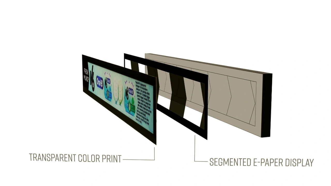 Die Fähigkeit des E-Ink-Displays, zwischen weißer Farbe und einer anderen Hauptfarbe – z. B. schwarz, gelb oder rot – zu wechseln, kann genutzt werden, um einen Bereich des angezeigten Inhalts zu betonen. Dies ist das Prinzip der Ink-In-Motion-Technik (IIM), zu Deutsch: »Tinte in Bewegung«. Der Hauptteil der Displays ist die bistabile E-Ink-Folie, die ihre Farbe ändern kann (Bild 1). Es ist kein Aktiv-Matrix-Display; demnach können grafische Inhalte nicht durch Bildpunkte dargestellt werden – es ist eher eine gefüllte Farbfläche, eine Art Segment.