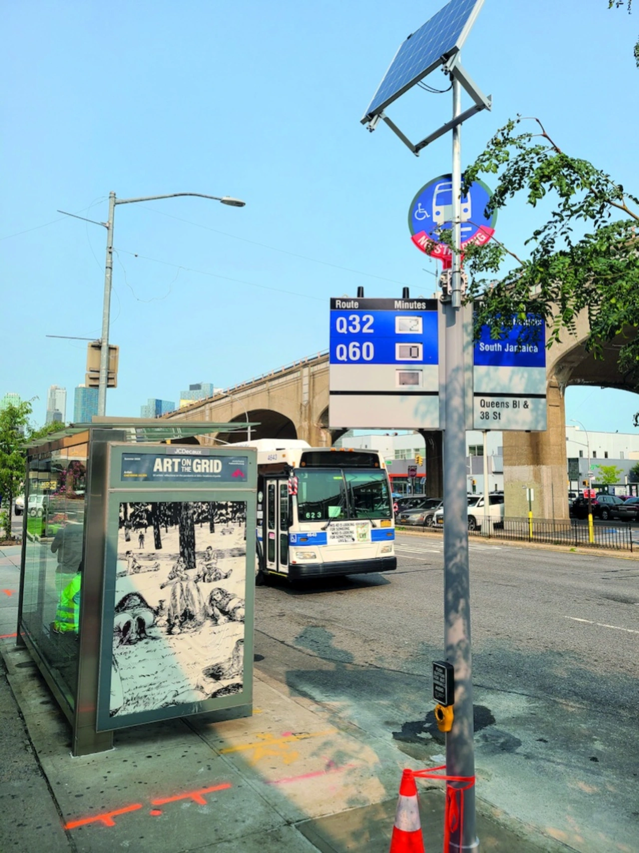 Das Außendisplay (Bild 5) läuft mit einer von Etulipa entwickelten elektronischen Steuerung. Im Betrieb kann die Leistungsaufnahme je nach Bildinhalt bis zu maximal 5 W/m2 betragen. Wird am Abend und in der Nacht eine Hinterleuchtung verwendet, dann kann die über den Tag gemittelte Leistungsaufnahme auf 7 W/m2 geschätzt werden. Die vollständige Außenanzeige wird mit einem Solarpanel und einer Batterie betrieben. Eine netzgebundene Aufladung ist nicht vorgesehen.