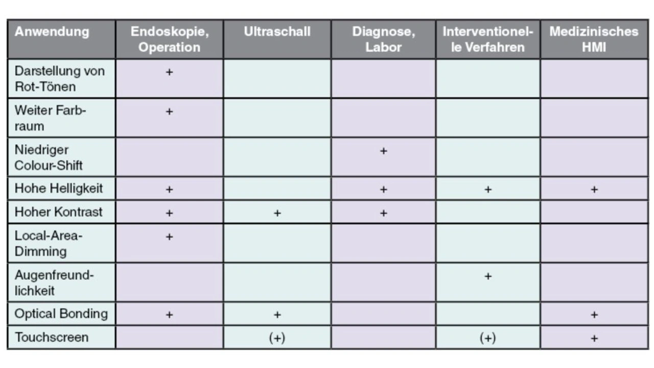Tabelle 1 zeigt, welche durchaus unterschiedlichen Anforderungen an ein Display gestellt werden, das in einem medizinischen Umfeld eingesetzt werden soll.