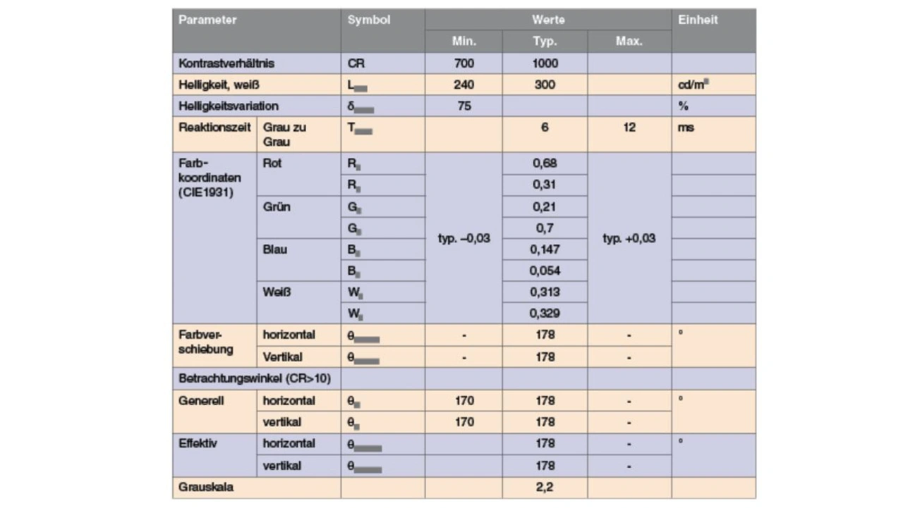 Im Datenblatt des Displays sind alle optischen Parameter in einer Tabelle zusammengefasst (Tabelle 2). Um Messwerte reproduzieren und vergleichen zu können, müssen bei den Messungen gleiche Bedingungen vorausgesetzt werden. Der Hersteller gibt in der Spezifikation detailliert an, mit welchen Aufbauten, Messgeräten und Verfahren die Werte ermittelt wurden. Vor Messungen muss der Prüfling Betriebstemperatur erreicht haben; die Messungen werden bei Raumtemperatur in einer dunklen Umgebung durchgeführt. Für die Betrachtung der Parameter in Tabelle 2 wurde die Spezifikation des LC-Displays LM270WQ3 von LG Display herangezogen.
