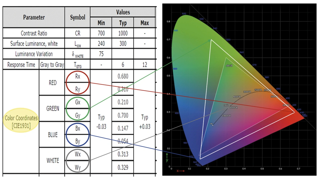 Für eine optimale Darstellung muss der Farbraum, der durch das Display dargestellt werden kann, möglichst weit sein. Bild 2 zeigt, wo die in der Tabelle 2 angegebenen Koordinaten der Primärfarben im Farbdiagramm zu finden sind. Nur diejenigen Farben, die innerhalb des aufgespannten Dreiecks (weiß dargestellt) liegen, können dargestellt werden. Von einem kräftigen Rot profitieren besonders Farbaufnahmen in der Chirurgie und Endoskopie, von der Ausgewogenheit die darstellbaren Graustufen bei Anwendungen wie MRT und CT.