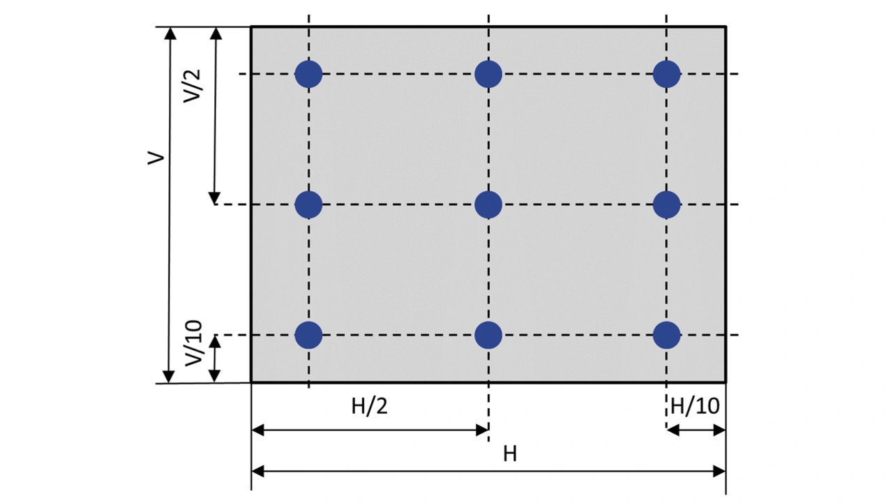 Für Displays, die in der medizinischen Befundung eingesetzt werden, ist auch die Uniformität der Helligkeit, das heißt die gleichmäßige Ausleuchtung der gesamten Fläche durch die Hinterleuchtung, wichtig. Sie ist im Datenblatt bei der Spezifikation der optischen Daten aufgeführt und hier besser als bei industriellen Modellen. Für ihre Bestimmung wird die Helligkeit an mehreren Stellen des Displays gemessen, siehe Bild 1.
