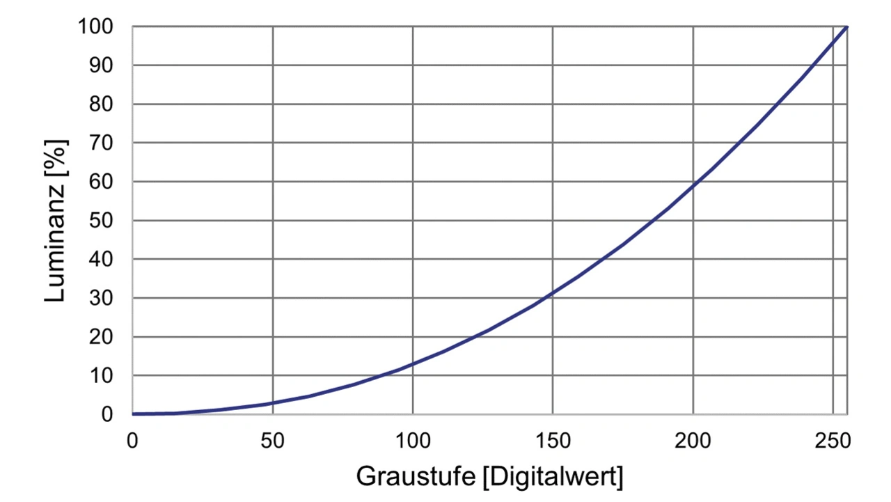 Die Wahrnehmung des Auges ist nicht linear zur Helligkeit. Die Gamma-Korrektur (Bild 3) kompensiert diese Nichtlinearität so, dass von dunkel nach hell ein linearer Eindruck entsteht. Medizinische Monitore werden gemäß DICOM kalibriert, sodass beim Austausch von Daten diese auf jedem Monitor gleich angezeigt werden.