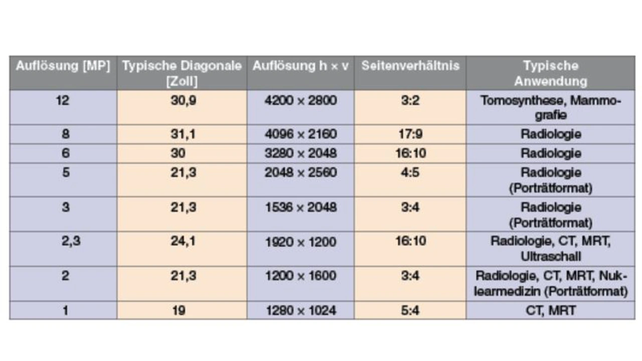 Eine hohe Auflösung ist wichtig, damit der Betrachter feine Strukturen differenzieren kann. Bestimmte medizinische Anwendungen erfassen Werte mit pixelorientierten Sensoren, z. B. in der Mammografie oder der Radiologie. Um dort Artefakte durch Skalierung zu vermeiden und das gesamte Bild darzustellen, werden Displays mit ungewöhnlichen Auflösungen eingesetzt. Dort werden teilweise monochrome Displays verwendet, die sich durch besonders hohe Helligkeit und einen großen Dynamikbereich auszeichnen. In der Medizintechnik werden Displays auch nach Anzahl der Bildpunkte in Megapixel (MP) und nicht der Auflösungen in horizontaler und vertikaler Richtung klassifiziert, siehe Tabelle 3. Für bestimmte Anwendungen, z. B. in der Mammografie, wird die Abbildung im Porträtformat bevorzugt.