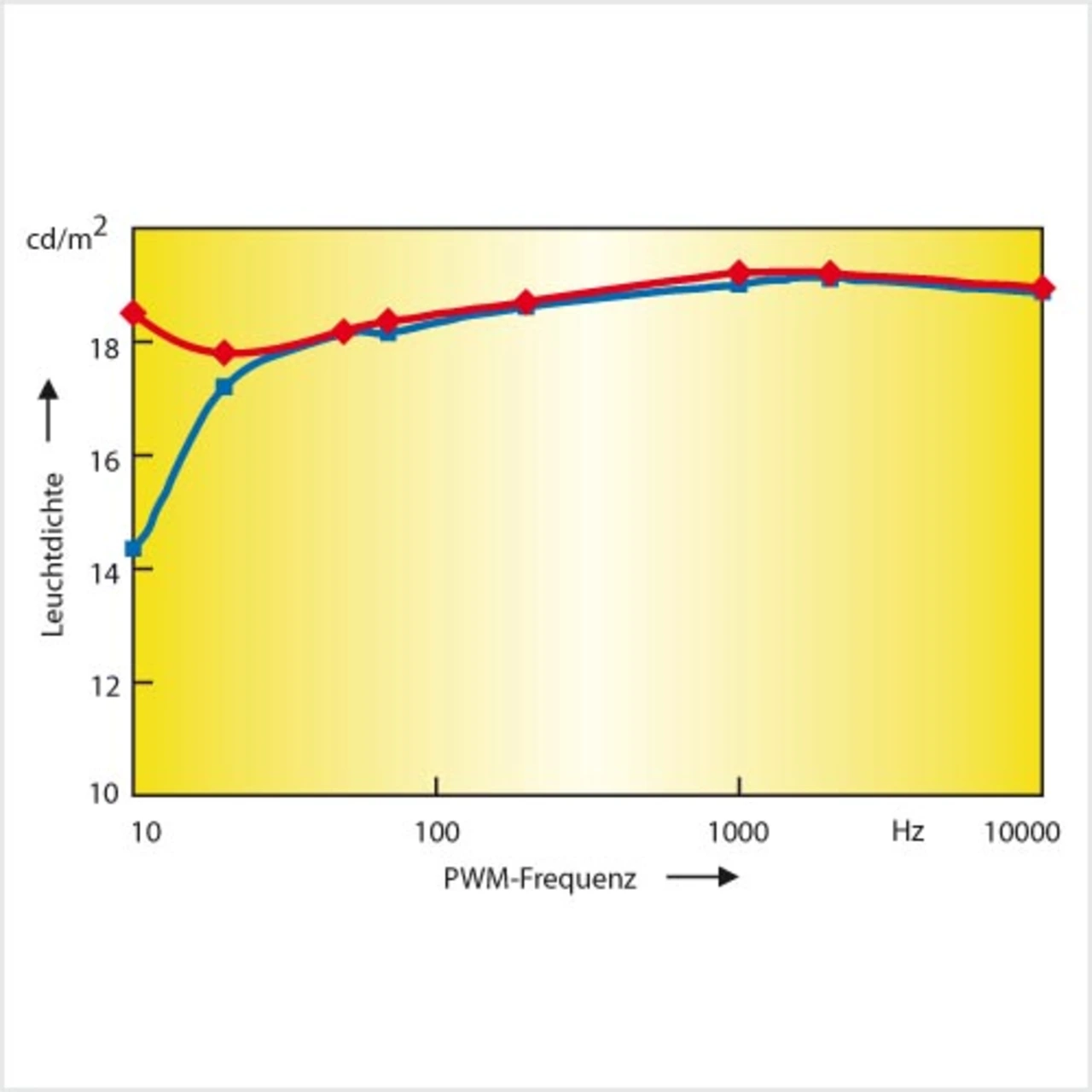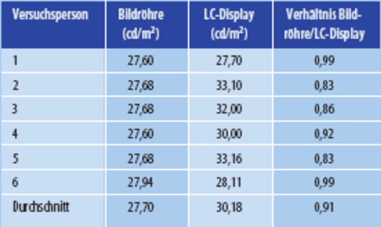 Die meisten Displays strahlen auch bei konstantem Bildinhalt moduliertes Licht ab, diese Modulation ist für das menschliche Auge in der Regel nicht wahrnehmbar. Beispiele sind PWM-gedimmte Hinterleuchtungen für LC-Displays sowie Plasma-Displays im Subframe-Verfahren. Für diese Messungen wurde ein Diffusor mit einer Leuchtdiode bestrahlt. Die Leuchtdiode wurde mit einem frequenzvariablen Generator mit Rechtecksignalen mit einem Tastverhältnis von 50 % angesteuert. Bild 1 zeigt das Ergebnis der Messungen: Bei kleinen Frequenzen liegen der maximale und der minimale Leuchtdichte-Messwert auseinander, da unterschiedlich viele Pulse pro Integrationsintervall gemessen werden. Dieser Bereich ist jedoch für die Praxis wenig relevant, da der Mensch auf einem derart betriebenen Display ein störendes Flackern beobachten würde. Ab 30 Hz ist jedoch kein wesentlicher Unterschied mehr zu beobachten. Da sehr viele Pulse pro Integrationsintervall gemessen werden, fällt ein einzelner Impuls nicht mehr ins Gewicht. Neben objektiven Messungen wurden auch subjektive Tests mit Studenten durchgeführt. Die Aufgabe bestand darin, einen Röhrenbildschirm über die Grafikkarte mittels Helligkeits-, Kontrast-, Gammawert- und Farb-Regler auf dieselbe wahrgenommene Helligkeit einer Graustufe des Referenz- AM-LC-Displays einzustellen. Mit dem Versuch sollte herausgefunden werden, ob die vom Menschen als gleich hell beurteilten Monitore auch dieselbe gemessene Leuchtdichte aufweisen. Hierzu eignen sich die pulsartig betriebenen Bildröhren und ungedimmte AM-LC-Displays besonders. Es wird hier sozusagen ein Gleichspannungssignal mit dem Mittelwert eines Wechselspannungssignals verglichen (Tabelle 2).