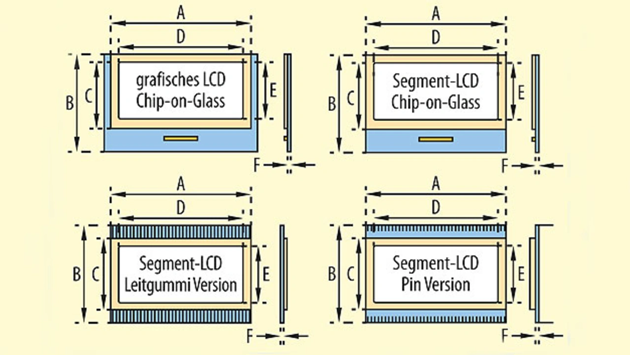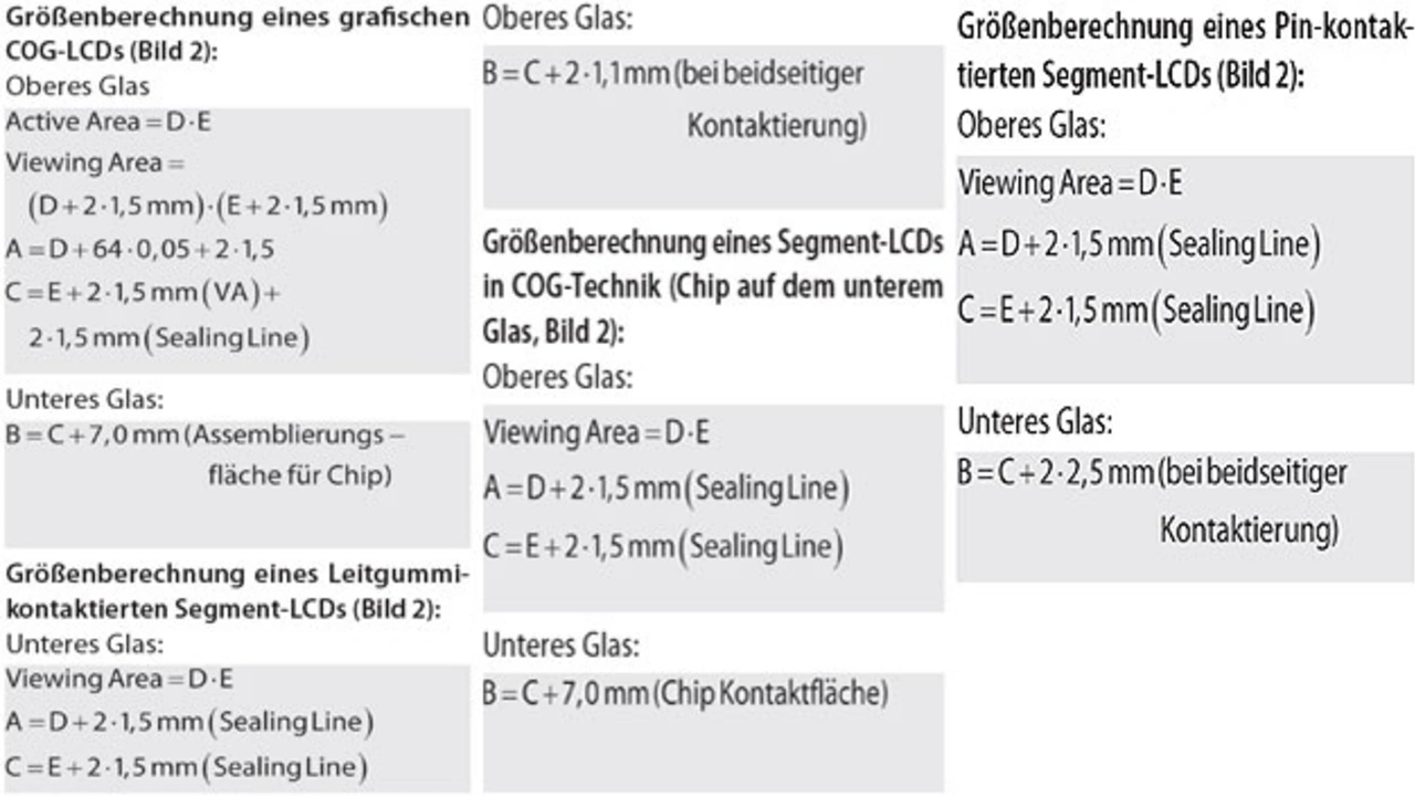 Für die sogenannte „Sealing Line“, also der Fläche, die zur Verklebung der Gläser zueinander und dem Einschluss des Fluids benötigt wird, sollten umlaufend +1,5 mm eingeplant werden. Für sogenannte Chip-on-Glass-Displays (COG), bei denen sich der Treiber-IC auf dem unteren Display-Glas befindet, sollte dieses an einer Seite um +7,0 mm verlängert werden, um eine ausreichende IC-Assemblierungsfläche zu schaffen (siehe Bild 3c). Bei Leitgummi-kontaktierten Displays sind 1,1 mm beidseitig für die Kontaktflächen hinzuzurechnen. Im Gegensatz zu den über Leitgummi kontaktierten Displays sind bei Pin-kontaktierten Displays 2,5 mm auf beiden Seiten für die Pin-Kontaktreihen vorzusehen.