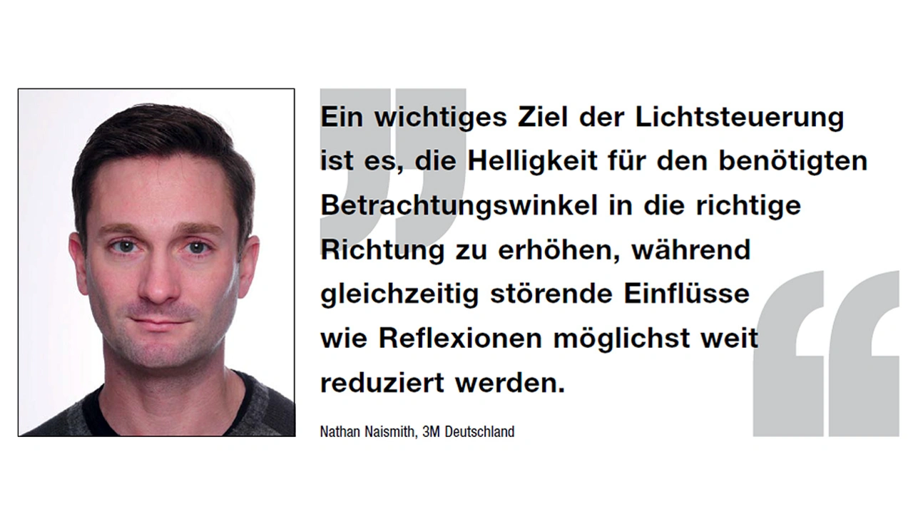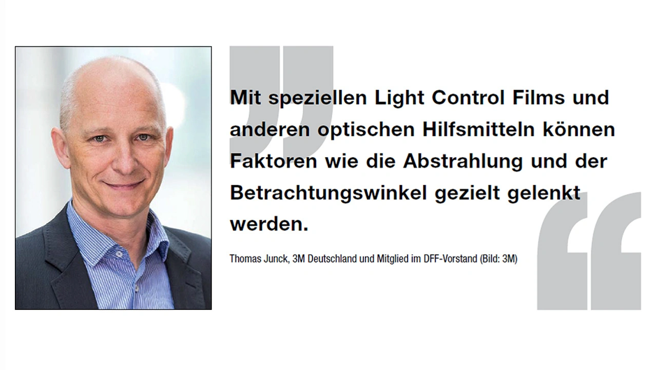 »Am größten ist die Herausforderung in dunklen Umgebungen, wie sie bei Nacht oder im schnellen Wechsel auch in Tunnels und Tiefgaragen herrschen«, führt 3M-Experte Thomas Junck aus, der sich als Mitglied im Vorstand des DFF, Global Network for Display Professionals, engagiert. »Eine sehr effiziente Möglichkeit, um den Betrachtungswinkel zu steuern, sind 3M Advanced Light Control Films.« Diese dienen nicht nur dazu, das Licht gezielt zu leiten und dadurch Reflexionen und die Ablenkung des Fahrers zu vermeiden. Zugleich ermöglichen sie es, die Privatsphäre der Mitfahrer zu schützen, indem die von ihnen betrachteten Informationen und Inhalte von der Seite her nicht einsehbar sind.