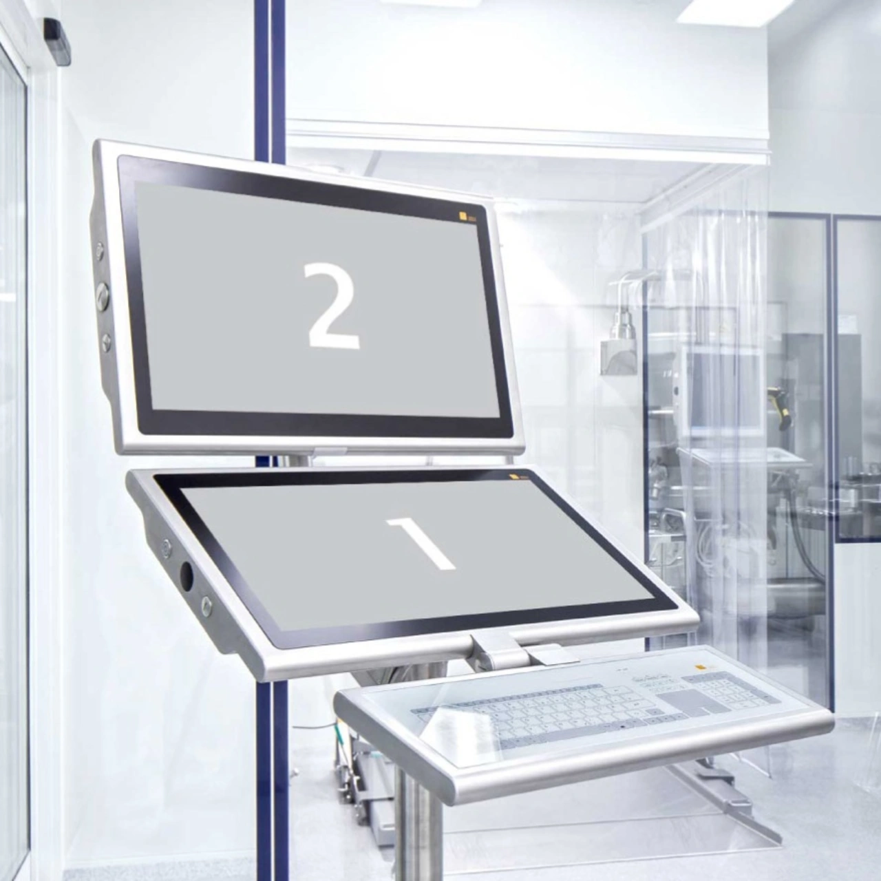 Im Reinraum ist es üblich das MES, das Prozessleitsystem oder andere Anwendungen gleichzeitig im Blick zu haben. Dafür bieten sich Dual-Display-Systeme an, die je eine Software je Bildschirm anzeigen. Bei ausreichend Platz kann das zum Beispiel über eine mobile, batteriebetriebene Arbeitsstation wie den Trolley Light Duplex gelöst werden. Auch über ein Tragarmsystem ist eine horizontale oder vertikale Anordnung zweier Bildschirme möglich, wobei eine Montage über einen besonders flexiblen U-Rohr-Tragarm wegen des Gewichts nicht realisierbar ist. Auch bei engen Platzverhältnissen oder geringer Tragkraft der Wände lassen sich Dual-Display-Lösungen oft nicht realisieren.