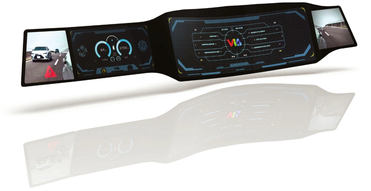 Das Fahrzeug-Cockpit ist eines der wichtigsten Designmerkmale. Ein homogenes Design wird erreicht, wenn die verschiedenen Anzeigeelemente in ein ganzheitliches Erscheinungsbild integriert werden können. Um die gewünschte Designfreiheit ohne Einschränkungen zu ermöglichen, setzt der Display-Spezialist Via optronics eine Kombination von Technologien ein. Dabei werden das patentierte Optical-Bonding-Verfahren und die »ColdForm«-Technologie von Corning sowie unterschiedliche Materialien wie etwa Glas, PMMA oder PC für die Cover-Lenses verwendet. Der »MaxVU«-Prozess für das Bonding und das eingesetzte proprietäre Material »Via bond plus« sind im Gesamtpaket aufeinander abgestimmt, sodass alle Cover-Lenses, Touchpanels und Displays reflexionsfrei verbunden und bei Sonnenlicht lesbar sind.
