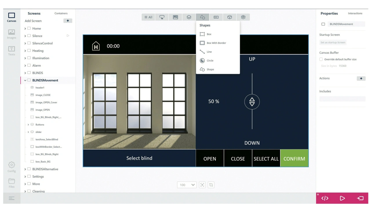 Wer möchte, kann mit TouchGFX seine gesamte GUI erstellen. Wer aber nur ein Grundgerüst braucht, um alles andere selbst zu programmieren, kann das ebenfalls tun. TouchGFX generiert für jede Seite, jedes Menü und jeden Button den benötigten C++-Code, der dann eingesehen und manuell erweitert werden kann. Zusätzlich unterstützt TouchGFX Entwicklungsumgebungen wie zum Beispiel IAR, Keil und MS Visual Studio.