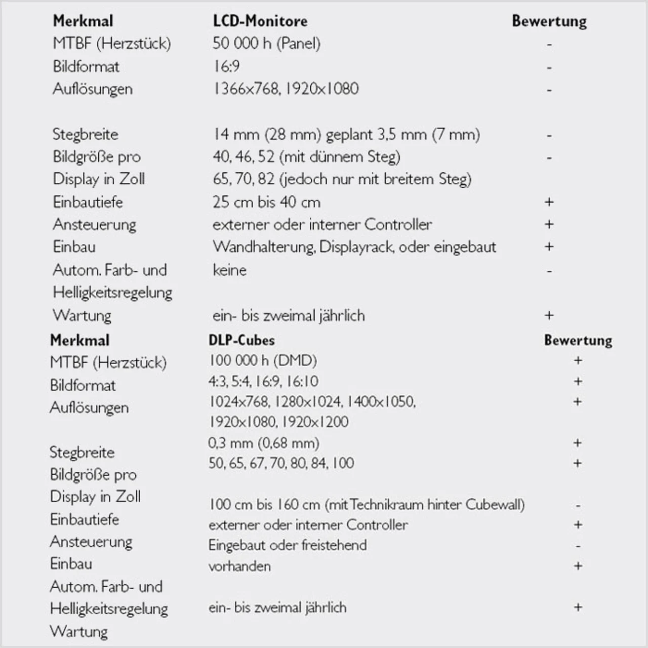 LCD-Monitore verfügen heute bereits über einen relativ dünnen Steg, besonders wichtig bei Aufbau als Videowand. Derzeit misst dieser Steg 14 mm pro Display und ist damit größer als bei den Cubes mit 0,3 mm. Es wird aber daran gearbeitet, diese Stege zu verkleinern. Das Bildformat bei LCD-Bildschirmen ist immer 16:9, wobei viele Software-Anwendungen mit 4:3 und 5:4 arbeiten. Demzufolge wird ein Bild einer solchen Software verzerrt dargestellt, wenn es vollflächig gezeigt wird, oder wenn es in nativer Auflösung gezeigt wird, sind oben und unten beziehungsweise an beiden Seiten schwarze Streifen sichtbar. Die DLP-Cubes wie die »EC«-Serie von Eyevis hingegen gibt es in den Formaten 16:9 (16:10), 4:3 oder 5:4.