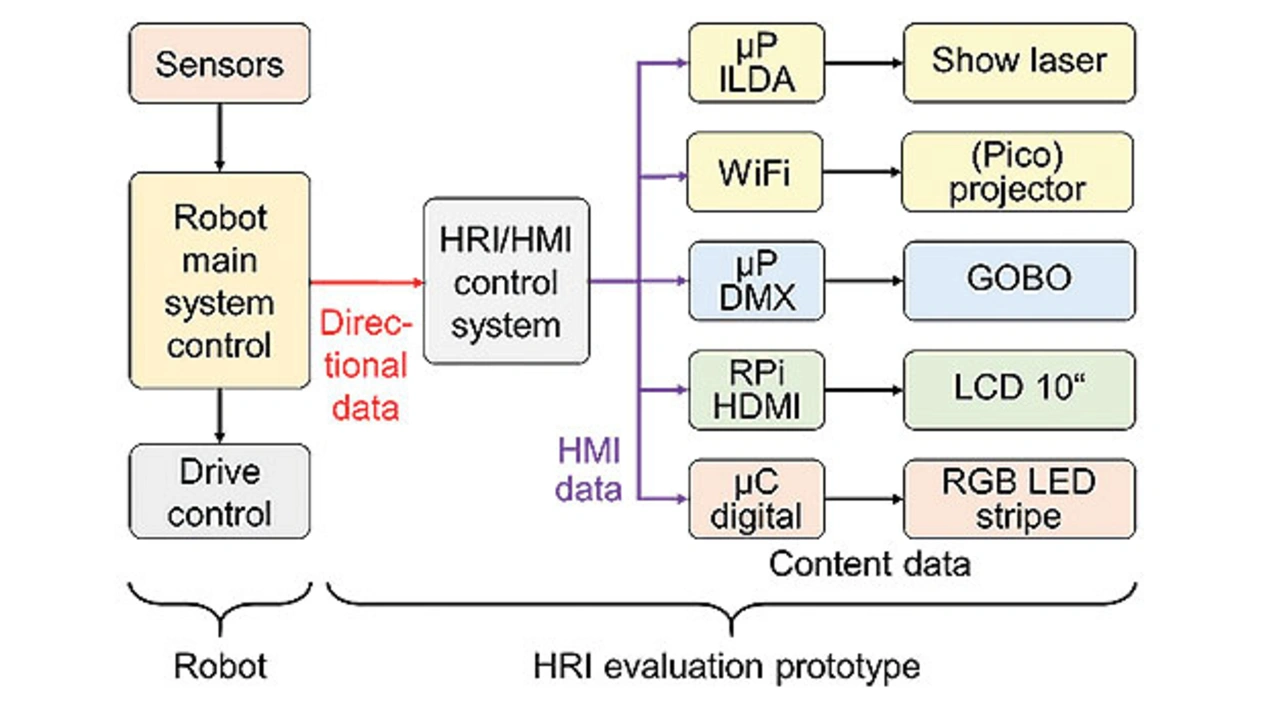 An einem Demonstrator haben die Forscher sechs verschiedene Anzeigentypen auf grundlegende Tauglichkeit für eine HRI-Anzeige untersucht: LED-Streifen, ein kommerzielles Tablet-Display, eine RGB-LED-Matrix und drei Projektoren. Das Blockschalt- bild des Demonstrators ist in Bild 5 zu sehen.