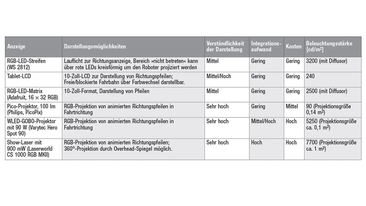 Bei der Vorauswahl der untersuchten Systeme wurde die Beschaffungssituation und Wirtschaftlichkeit berücksichtigt. Da Serviceroboter in Stückzahlen von einigen Tausend pro Jahr gefertigt werden, kommen z. B. keine Displays mit hoher kundenspezifischer Anpassung in Frage – entsprechende Aufträge lassen sich kaum bei den Displayfertigern platzieren oder nur mit unverhältnismäßig hohen Kosten. Die Ergebnisse der Bewertung sind in Tabelle 1 zusammengefasst. Die angegebenen Werte für die Beleuchtungsstärke sind Messergebnisse der Autoren und wurden unter Dunkelraum-Konditionen aufgenommen.