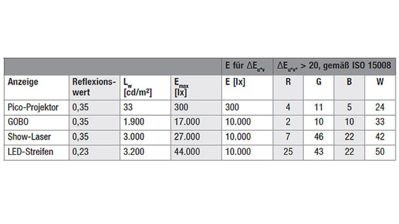 Umgebungslicht verwischt auch die Unterschiede zwischen verschiedenen Farben. Der gerade noch vom Menschen wahrgenommene Farbunterschied zwischen zwei Farbtönen wird mit ΔEu*v* = 1 angegeben. Die ISO 15008 fordert mindestens einen Wert von 20. In Tabelle 2 wurden diese Werte ebenfalls berechnet. Für den Pico-Projektor wurde dazu 300 lx Umgebungslicht angenommen, für die übrigen Systeme 10.000 lx, was einem Innenraum mit großen Fensterflächen bei Sonnenlicht entspricht. Die besten Resultate erzielen der Show-Laser (Bild 7) und der LED-Streifen. Sie können auch bei hellem Tageslicht an öffentlichen Plätzen eingesetzt werden.