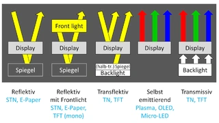 Da die Hinterleuchtung des LC-Displays die größte Leistung in einem Gerät aufnimmt, soll für eine mobile Applikation eine Display-Technik ausgewählt werden, die möglichst wenig Energie braucht. In Bild 1 sind die im Folgenden vorgestellten Display-Techniken zum Vergleich dargestellt.