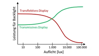 Ein transmissives Display moduliert die Helligkeit der dahinter liegenden Beleuchtung. Es eignet sich gut für Geräte, die in Umgebungen mit mäßiger Helligkeit eingesetzt werden, erzielt einen hohen Kontrast und ist hervorragend ablesbar. Mit zunehmender Umgebungshelligkeit muss die Intensität der Hinterleuchtung zunehmen, damit der Displayinhalt ablesbar bleibt. Damit steigt die Stromaufnahme der Hinterleuchtung. Im Vergleich dazu ist die Leistung zum Betrieb des Displays und der Ansteuer-Logik klein. Bei einem typischen TFT-Display, z. B. von LG Display mit 7“-Diagonale, benötigt die Logik 0,9 W, die Hinterleuchtung bei 450 cd/m2 hingegen 3 W.
